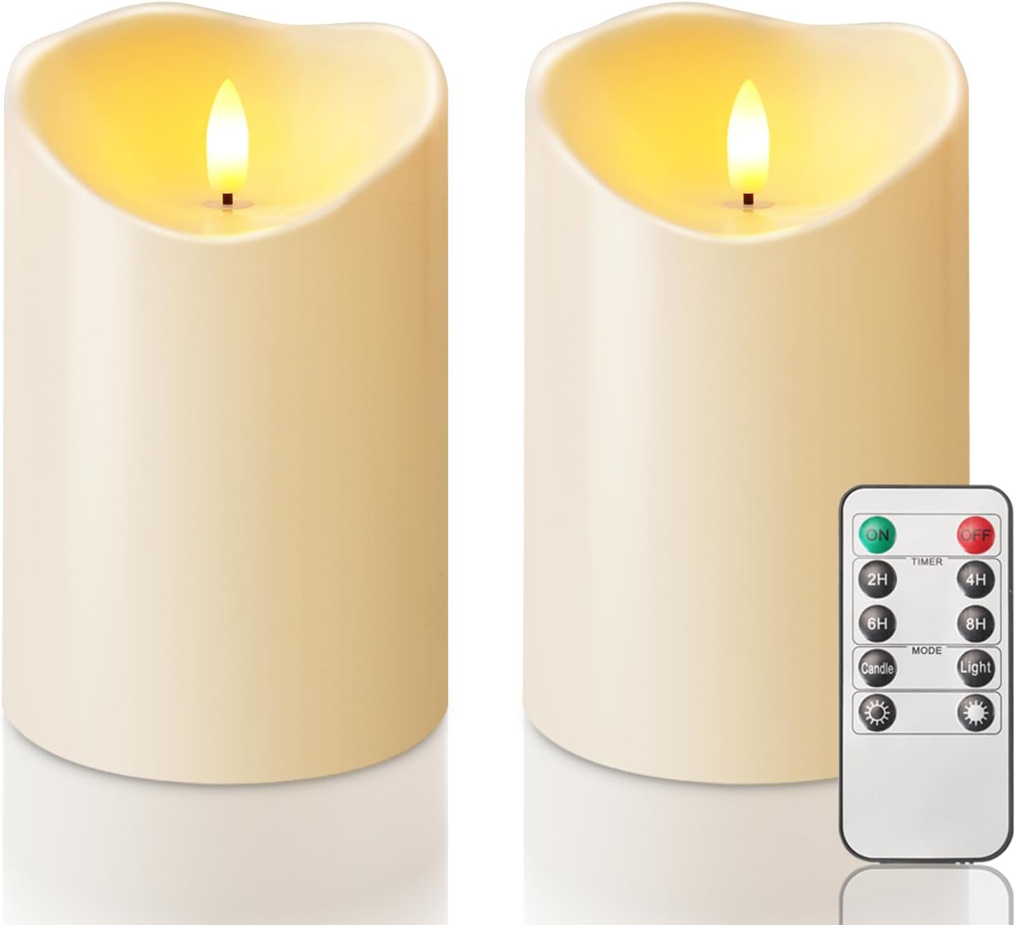 Homemory 4"x6" Outdoor Waterproof Flameless Candles with Timers and Remote Control, Battery Operated Candles, LED Plastic Candles, Dark Ivory, Set of 2