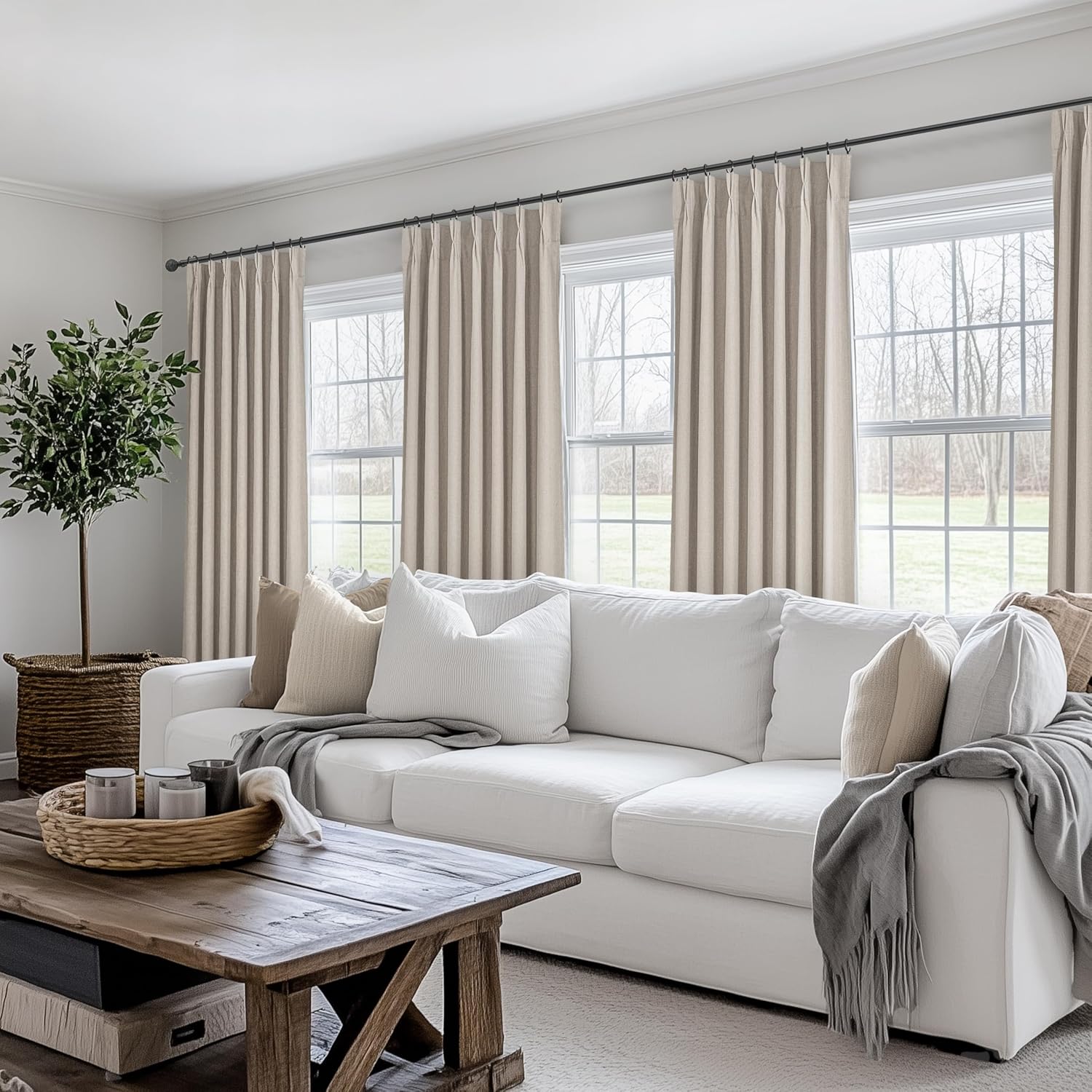• Pinch Pleats Design:Each panel has 7 pleats.linen draperies are crafted from blended fabric(30%linen,70%polyester),drapes well and not easy-wrinkle.Suitable for various styles:modern,farmhouse,boho,neutral,bedroom,living room,nursery,sliding door,etc.