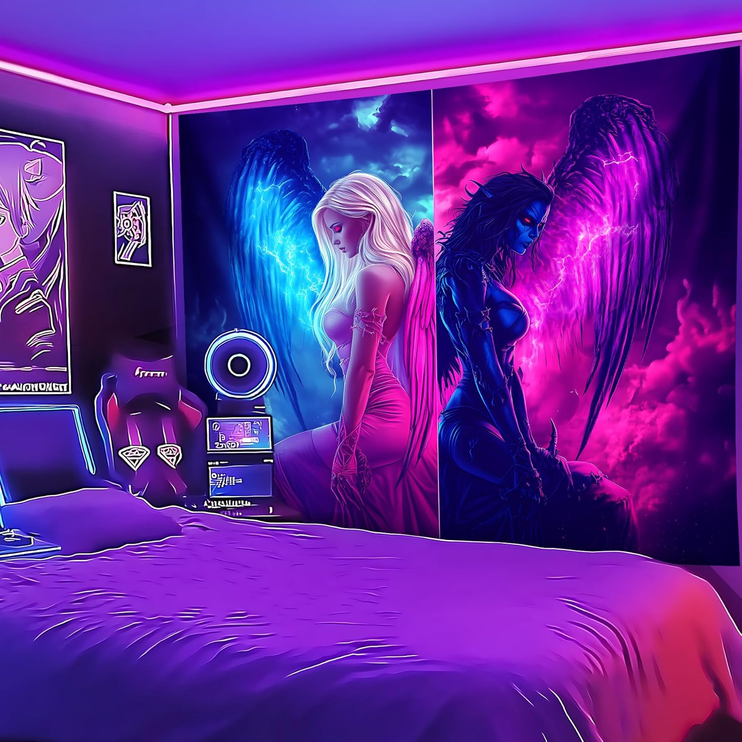 • 【Blacklight/UV Reactive】 Due to the special ink and advanced technology, the blacklight wing tapestry's colors can be changed under Black Light or UV Reactive Light. You can enjoy different effects by kinds of light, the tapestry will be amazing. Under normal light, the colors are also beautiful.