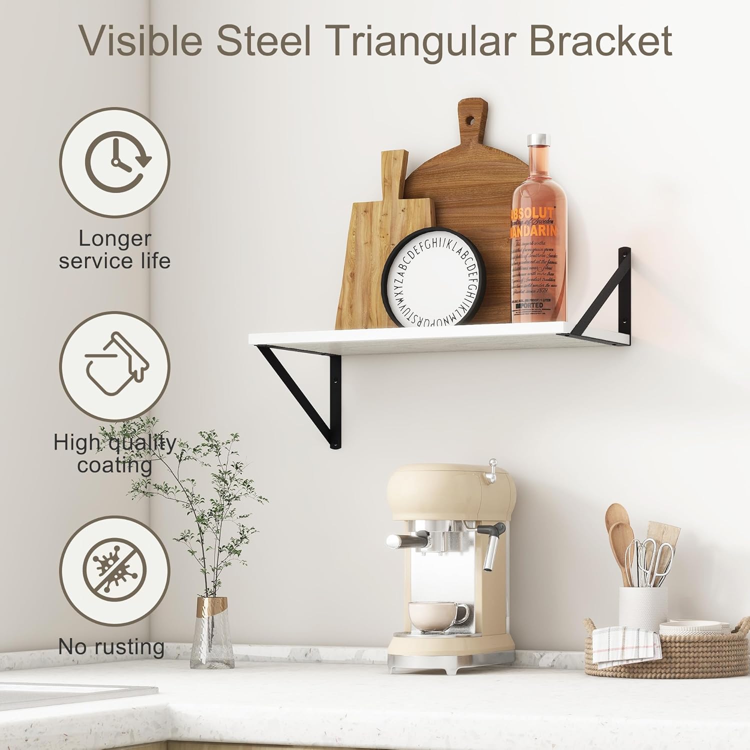• 【FARMHOUSE RUSTIC WALL SHELF】These floating shelves are made of premium engineered wood board and visible triangular bracket. The rustic wooden grain surface add character and warmth to any modern or traditional interior with these deep floating shelves, contrast shelves at staggering heights on the wall or mount side-by-side or in the corner for a clean streamlined look.