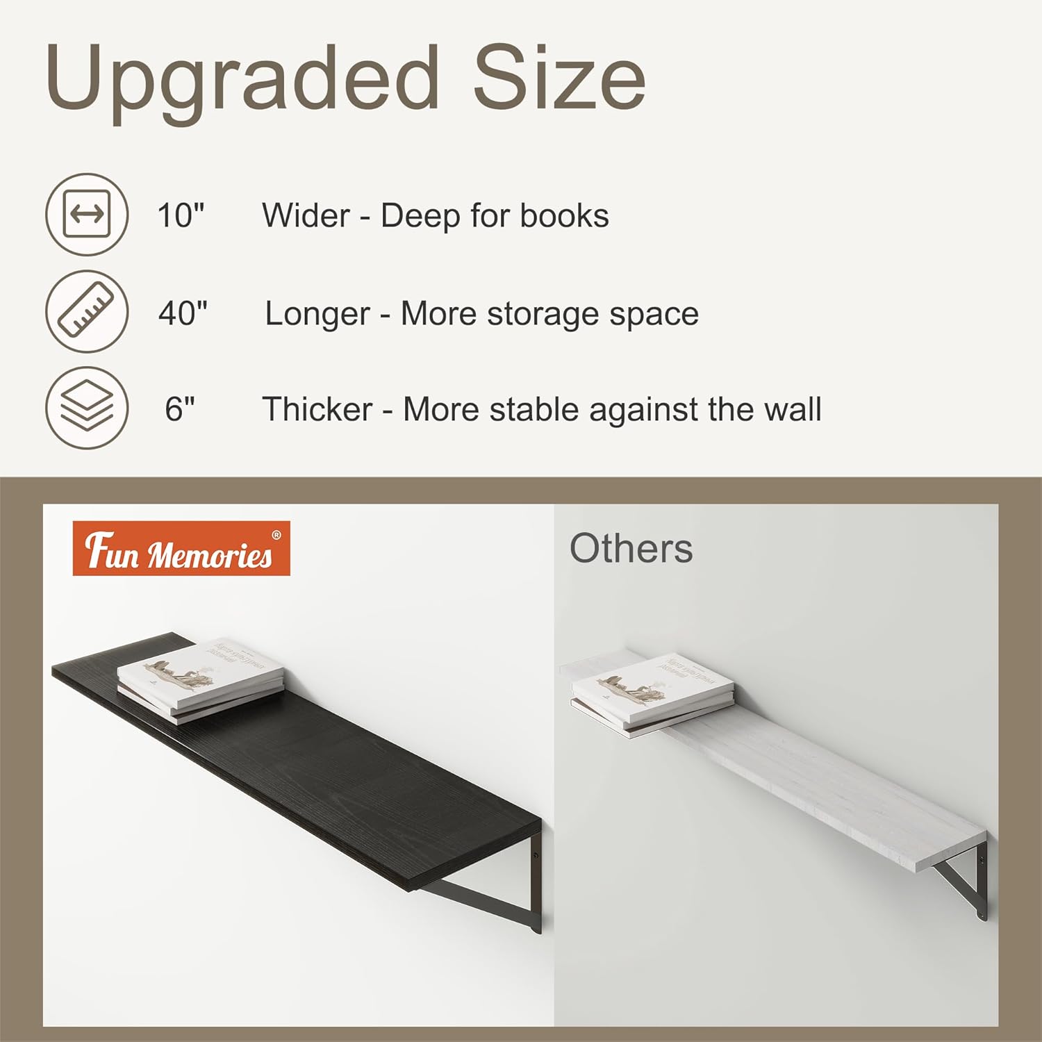Fun Memories 40 Inch Floating Shelves, 10 Inch Deep Wall Shelf, 40 x 10 Floating Shelf Set of 2, Black Wood Floating Shelf Wall Mounted, Large Kitchen Living Room Bedroom Storage Shelves