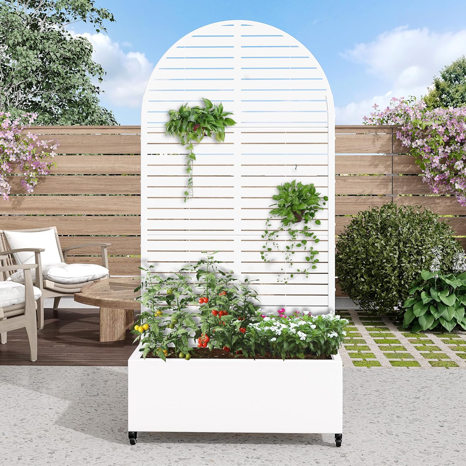 Casaphoria Metal Raised Garden Bed with Trellis and Wheels, 72"x35"x16" Arched Planter Box for Climbing Plants, Vegetables & Vines, Features Drainage Holes and Privacy Screen (White-Louvered)