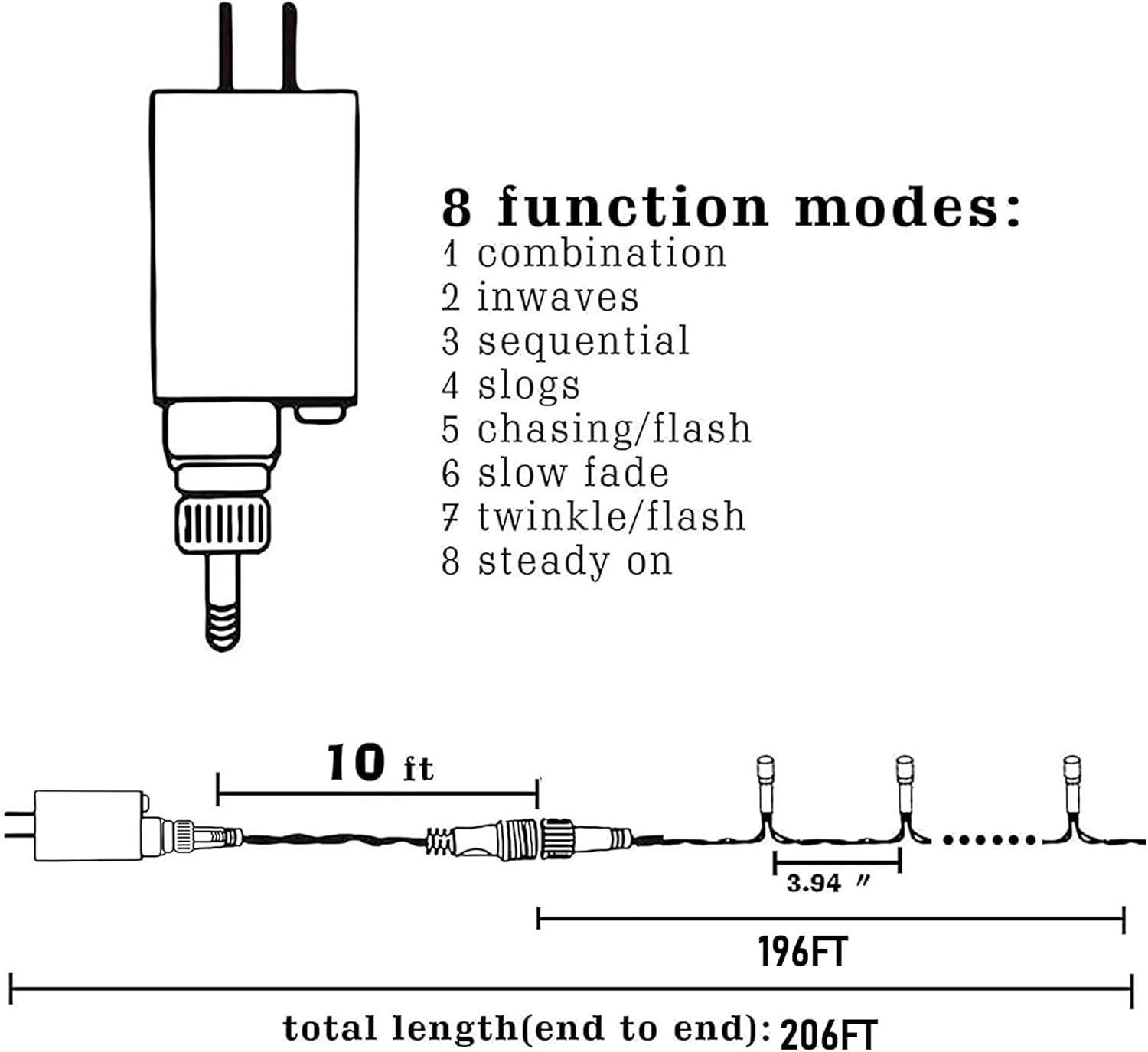 • Details: This Halloween string light set comprises 600 LED bulbs. It features a 10 ft leading wire and a 196 ft light string, making the overall length 206 ft. With a bulb spacing of 3.9 inches, it can create a lively and eerie ambiance for your Halloween party or decoration