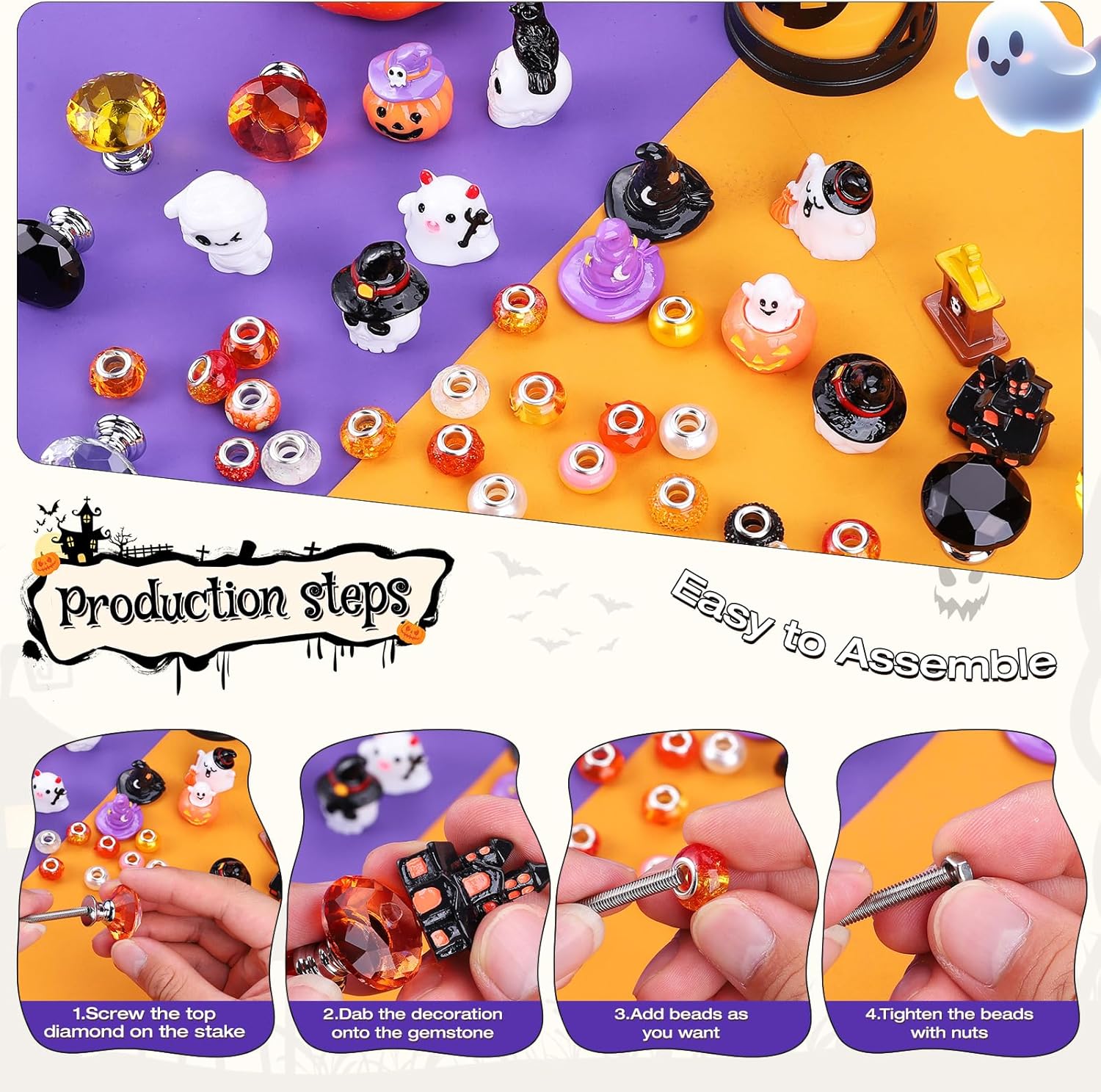 • Package Included: Halloween bead pile contains a variety of Halloween series elements, with colorful beads to help your garden add more style. You will receive a total of 358 products, including 12 crystal stoppers, 6 10-inch threaded rods, 6 12-inch threaded rods,240 beads, 12 Halloween decorations, 50 different Halloween pendants,12 screw caps, 20 glue dots.