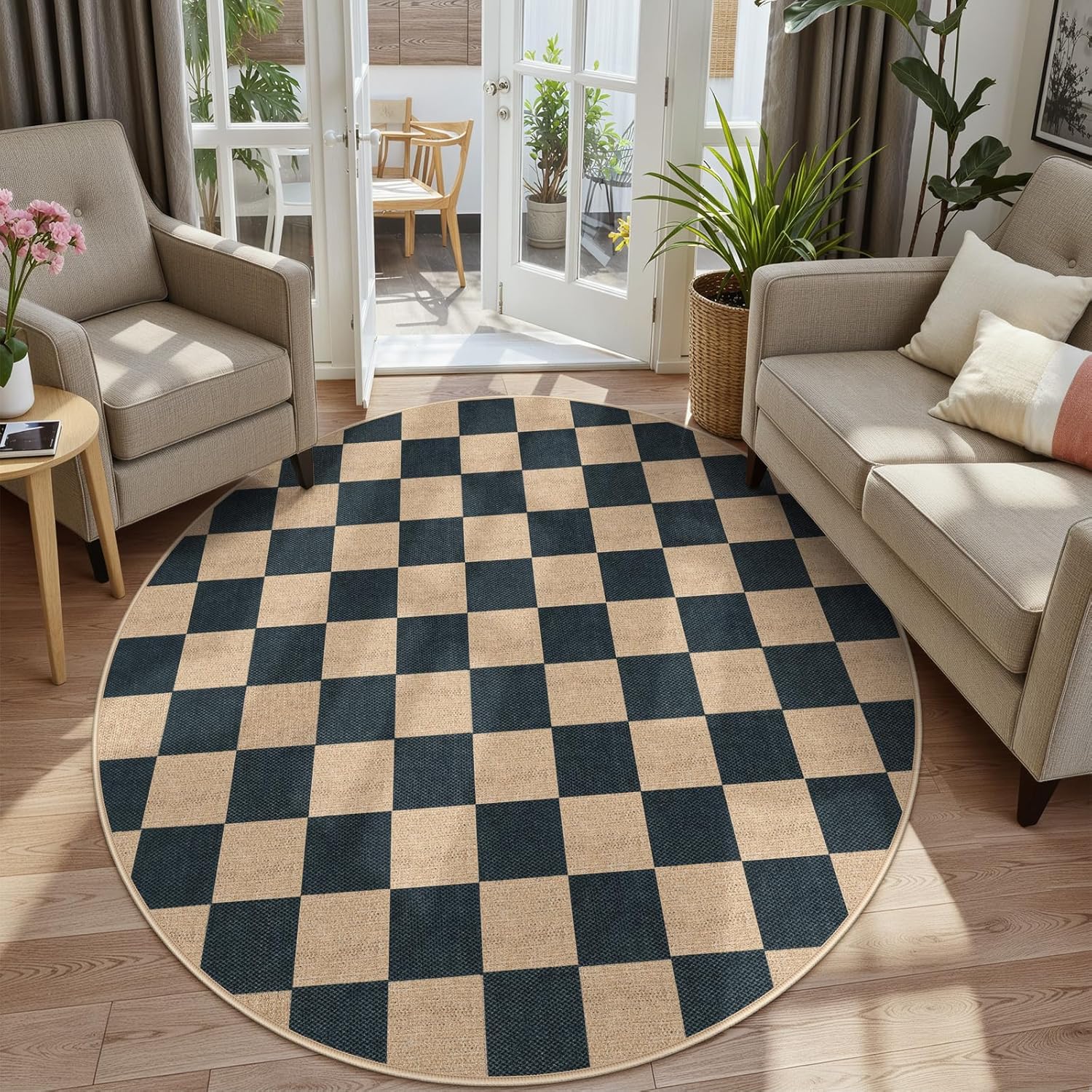 Lahome Checkered Round Rugs 6ft, Outdoor Patio Easy Jute Rug Indoor Outdoor Circle Carpet, Farmhouse Nature Non Shedding Non Slip Washable Black Carpet for Living Room Entry Deck