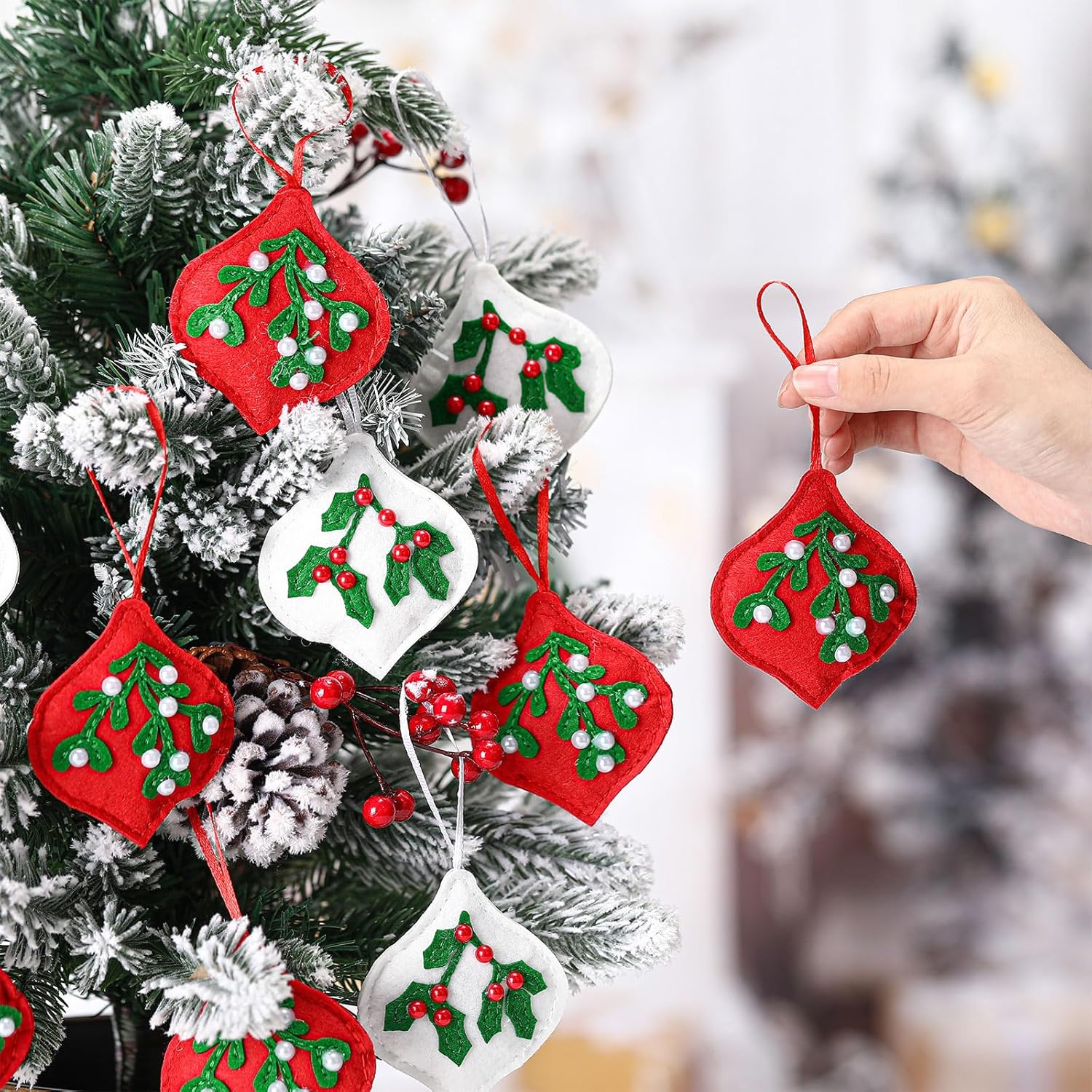 12 Pcs Christmas Felt Ornaments for Tree Red and White Mistletoe and Holly Leaves with Berries Poinsettias 3D Hanging Decorations Hanging Felt Craft for Christmas Party Favors Gifts