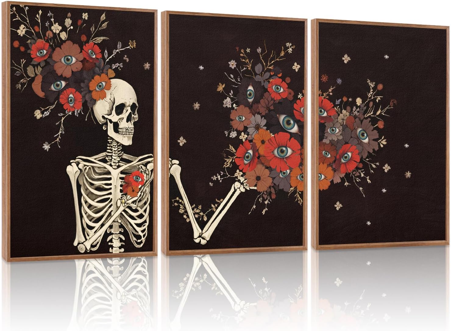 KAIRNE Gothic Skull Wall Art,Halloween Skeleton Canvas Set of 3(16”x24”),Scary Skull Painting,Horror Floral Botanical Prints,Romantic Spooky Halloween Wall Art for Living Room Bedroom Goth Party Decor