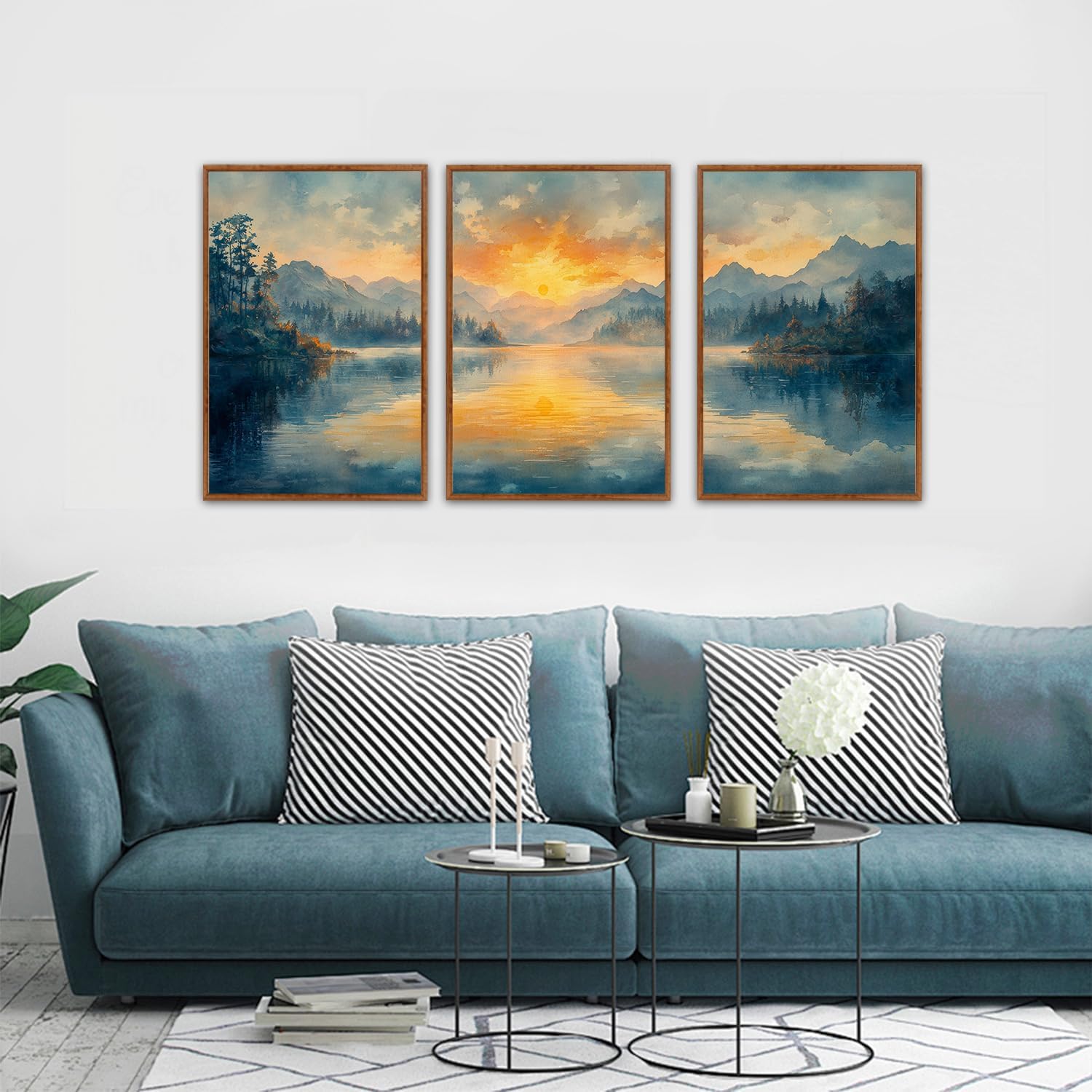 • [Blue Landscape Canvas Wall Art] Our set of sunset wall art paintings depicts the beautiful scenery of clothes,including elements such as lakes,forests and mountains.Hanging it in your indoor space will surely bring you a serene and peaceful atmosphere