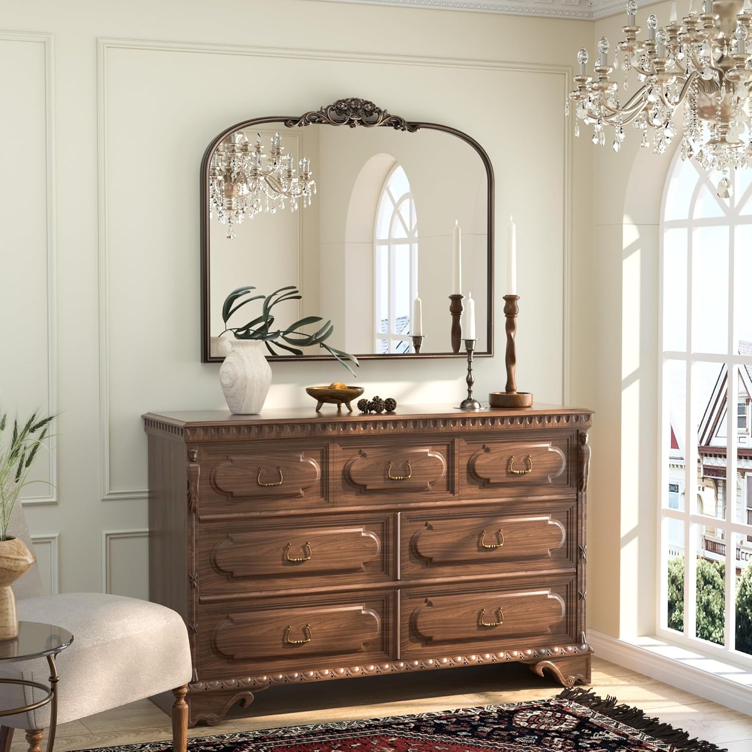 • 【Versatile Artistry for Every Setting】Available in multiple sizes and finishes, our Antique decorative Mirror adapts to your aesthetic vision. Whether anchoring a living room gallery wall, amplifying light in a hallway, or adding intrigue to a powder room, its adaptable elegance elevates bedrooms, entryways, staircases, and beyond.