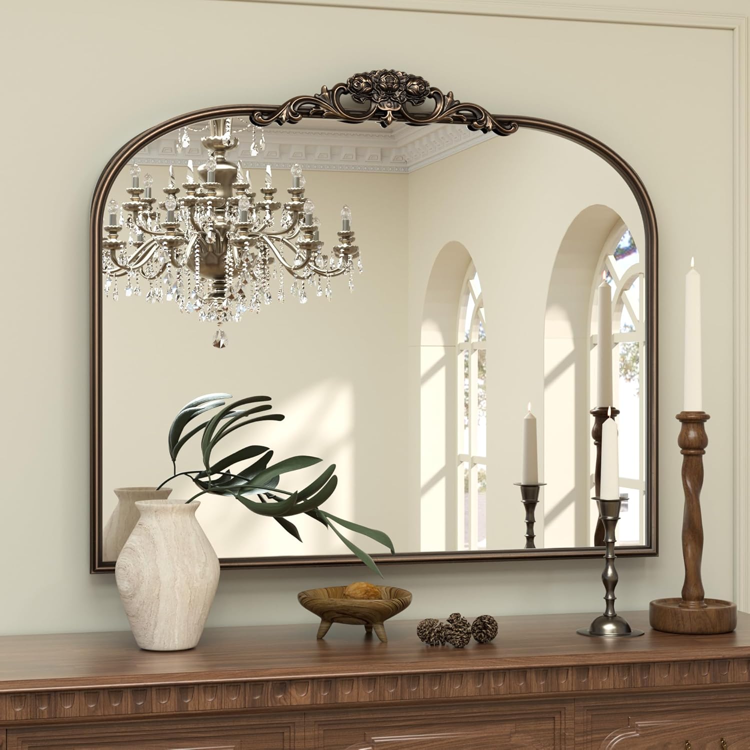 • 【Elevate Your Space with Baroque Grandeur】The Keonjinn Vintage Mirror is a masterpiece of timeless elegance, channeling the lavish artistry of the Baroque era. Its sweeping arched silhouette, adorned with an intricately carved wooden floral crown, transforms walls into canvases of historical opulence. Perfect as a statement centerpiece, this mirror infuses rooms with regal charm and a touch of old-world drama.