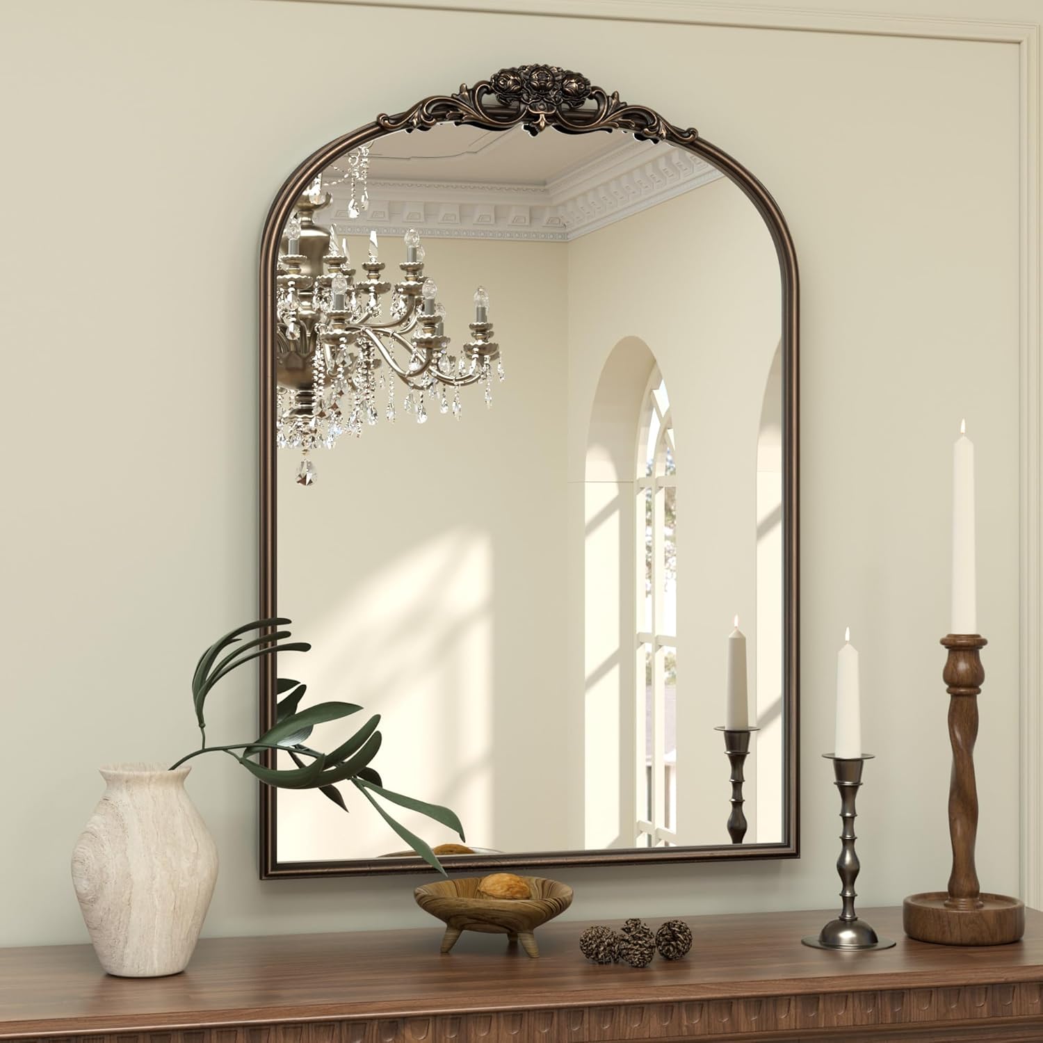 • 【Architectural Craftsmanship, Built to Last】Forged from a robust metal framework, this Arched mirror balances delicate beauty with unwavering durability. The hand-rubbed antique finish deepens its character, casting a warm, museum-worthy glow that enriches modern and traditional interiors alike. 〈The frame’s patina shifts subtly in varying light – from golden warmth in daylight to enigmatic depth under evening lamps – making every interaction with this piece a discovery.〉