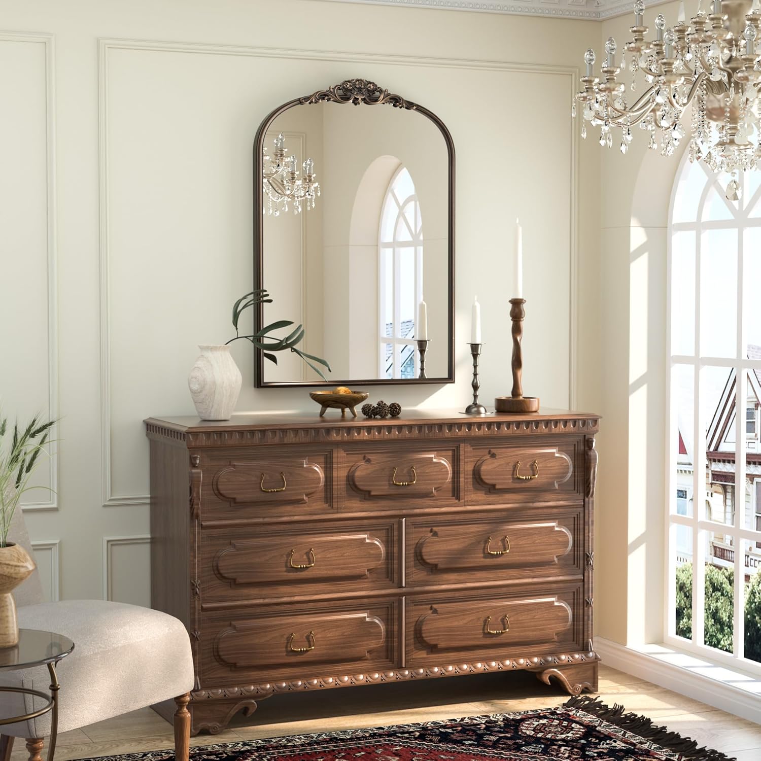 • 【Elevate Your Space with Baroque Grandeur】The Keonjinn Vintage Mirror is a masterpiece of timeless elegance, channeling the lavish artistry of the Baroque era. Its sweeping arched silhouette, adorned with an intricately carved wooden floral crown, transforms walls into canvases of historical opulence. Perfect as a statement centerpiece, this mirror infuses rooms with regal charm and a touch of old-world drama.