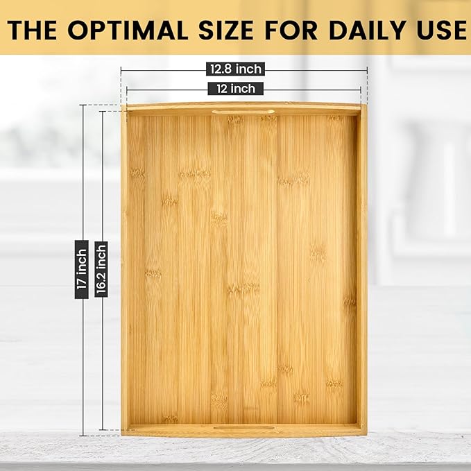 • LARGE SIZE:Our large bamboo tray (17" × 13" × 1.5") has a very large capacity. Its inner dimension (16.2" × 12") is more than enough to hold a 12-inch pizza, making it perfect for holding various foods and placing all kinds of items