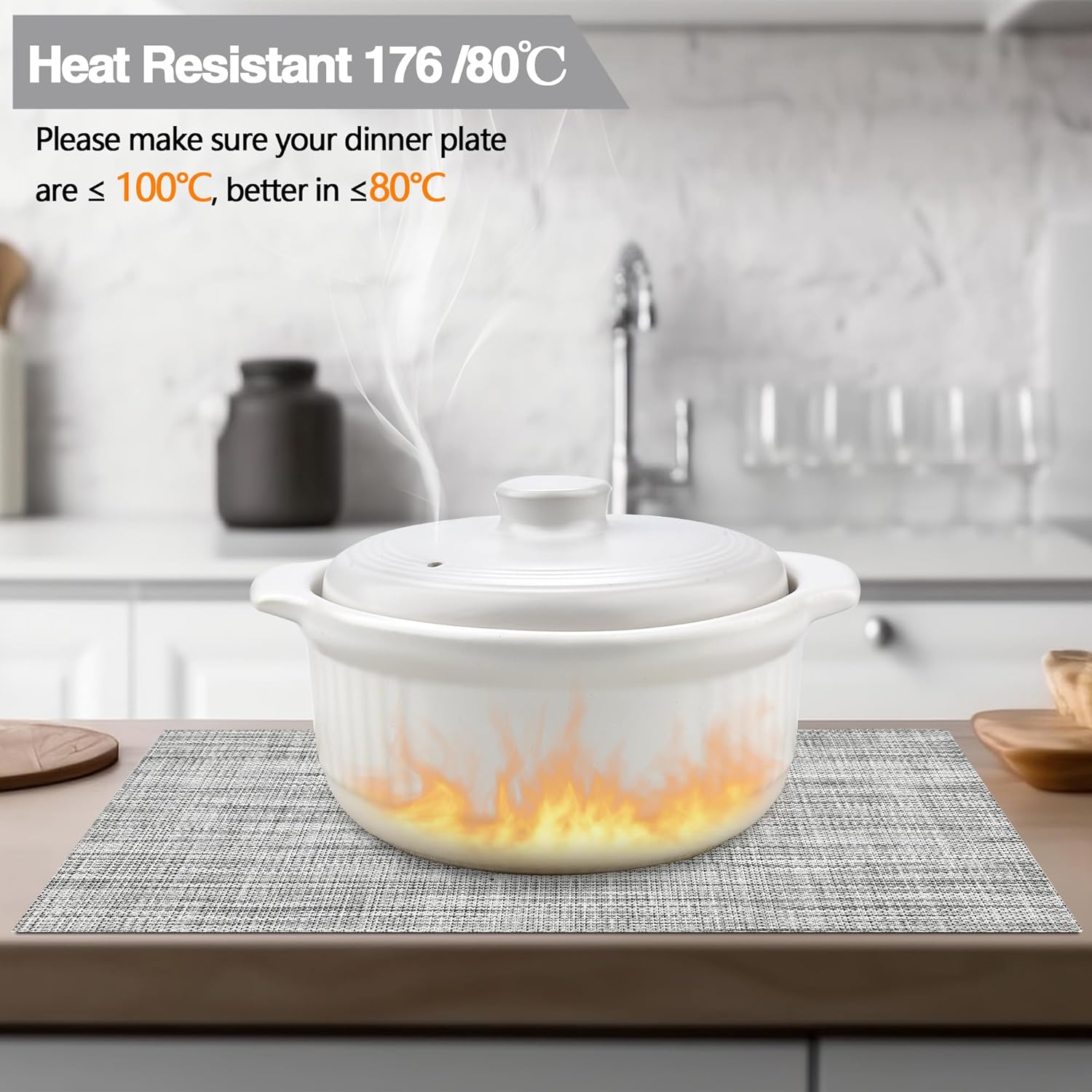 • Heat Resistant: Please make sure your dinner plate are ≤ 100℃, better in ≤80℃. It can prevent the table from slipping and scalding the countertop. These beautiful stylish vinyl place mats to add more fun to your dining table