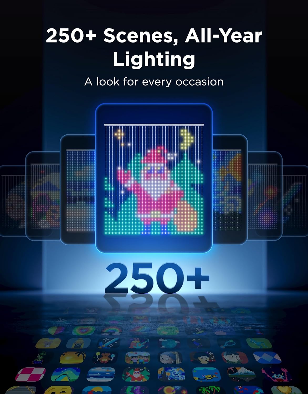• Year-Round Lighting: The curtain fairy lights bring any occasion to life with 250+ preset modes, tailored for holidays, parties, and daily ambience. Activate 10 music sync modes to let your lights pulse in perfect harmony with sound