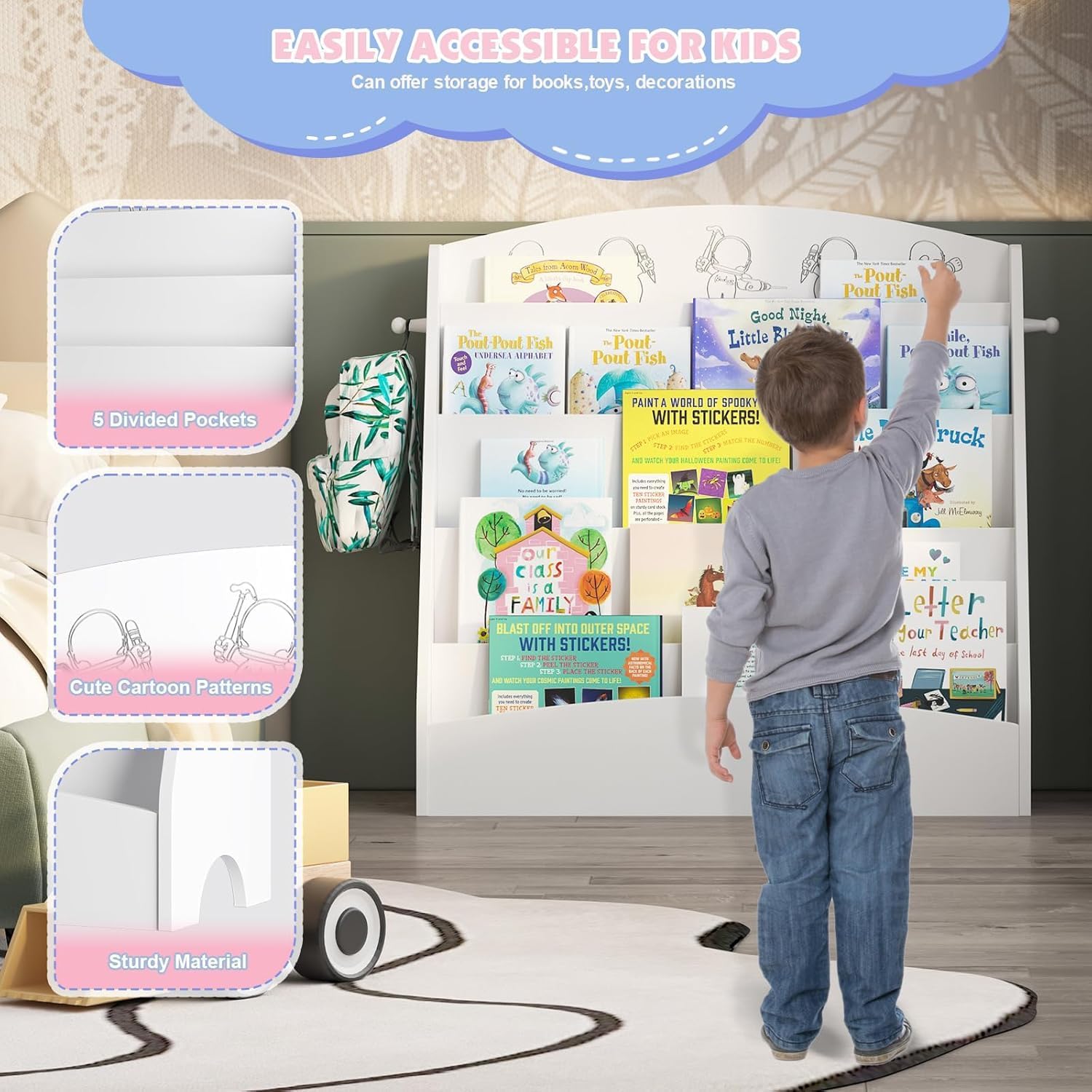 • 5-Tier Display and Storage Shelves: This 5-layer kids bookcase provides ample storage space for your children's storybooks, picture books, magazines, cardboard books, comics, and more. With reasonable depth, it is an ideal option for kids to categorize and organize their books and keep their room neat and clean.