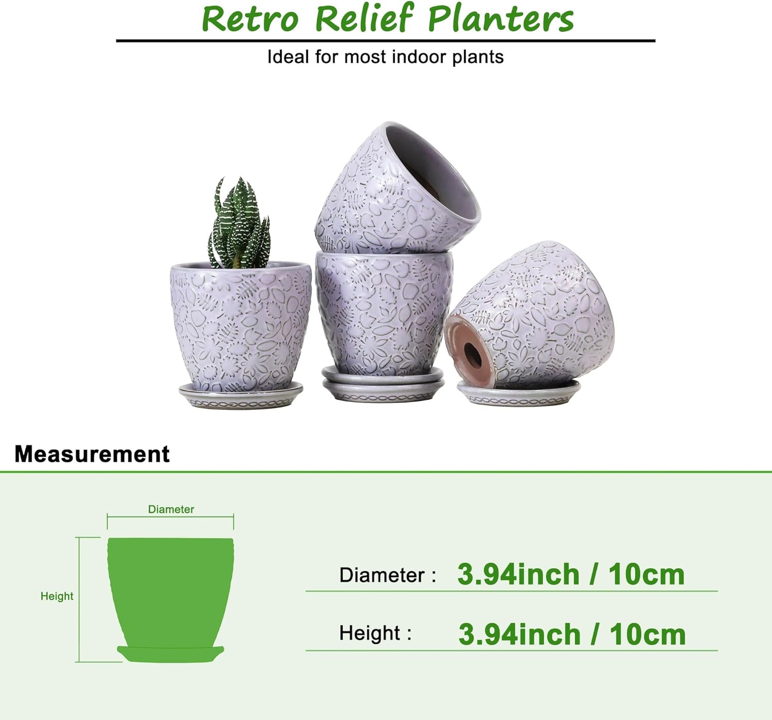 • Size & Package: 4.0 Inch Pot - Set of 4. Package: contains 4 ceramic flower pots, 4pcs mesh pads and 4pcs saucers(NOT INCLUDE PLANTS)