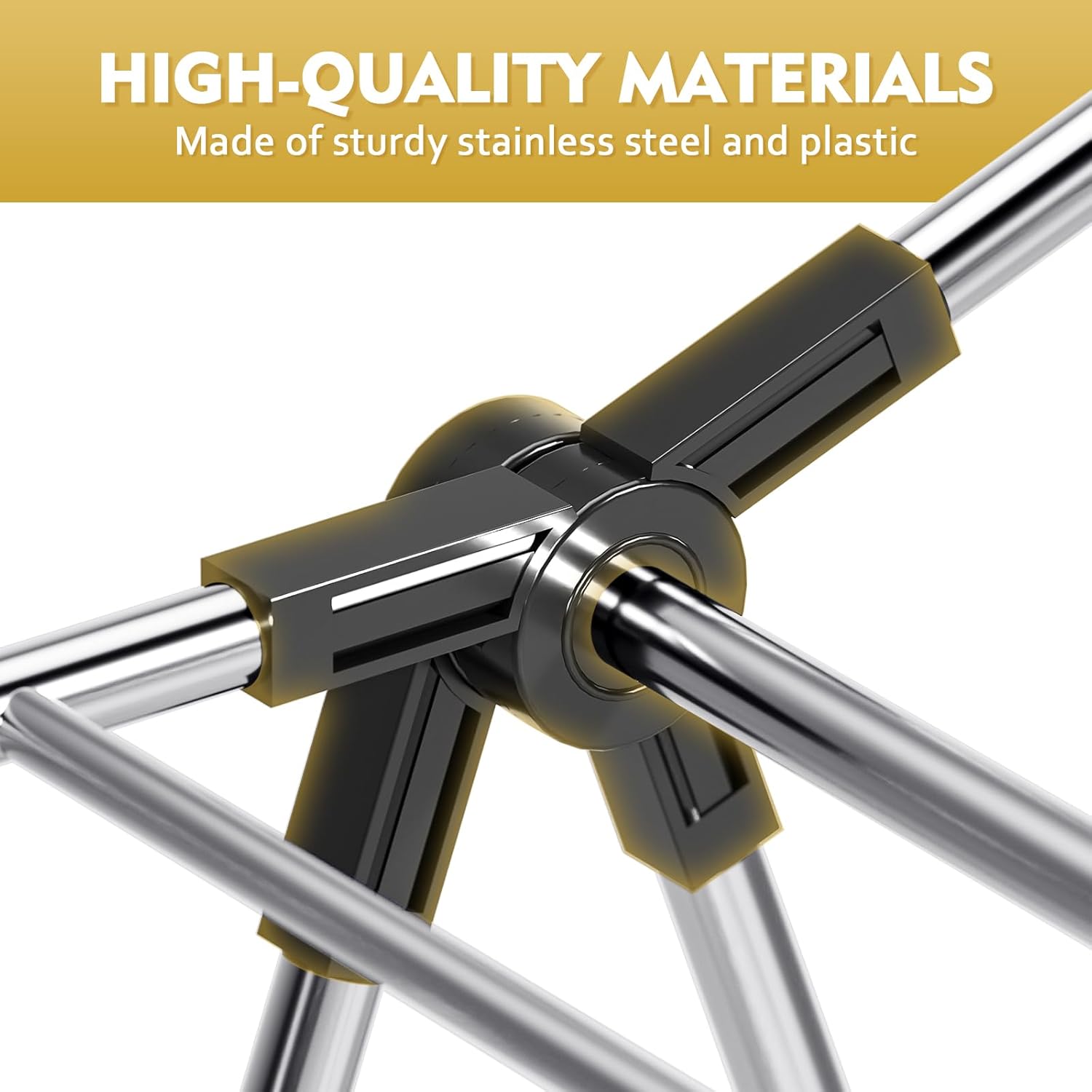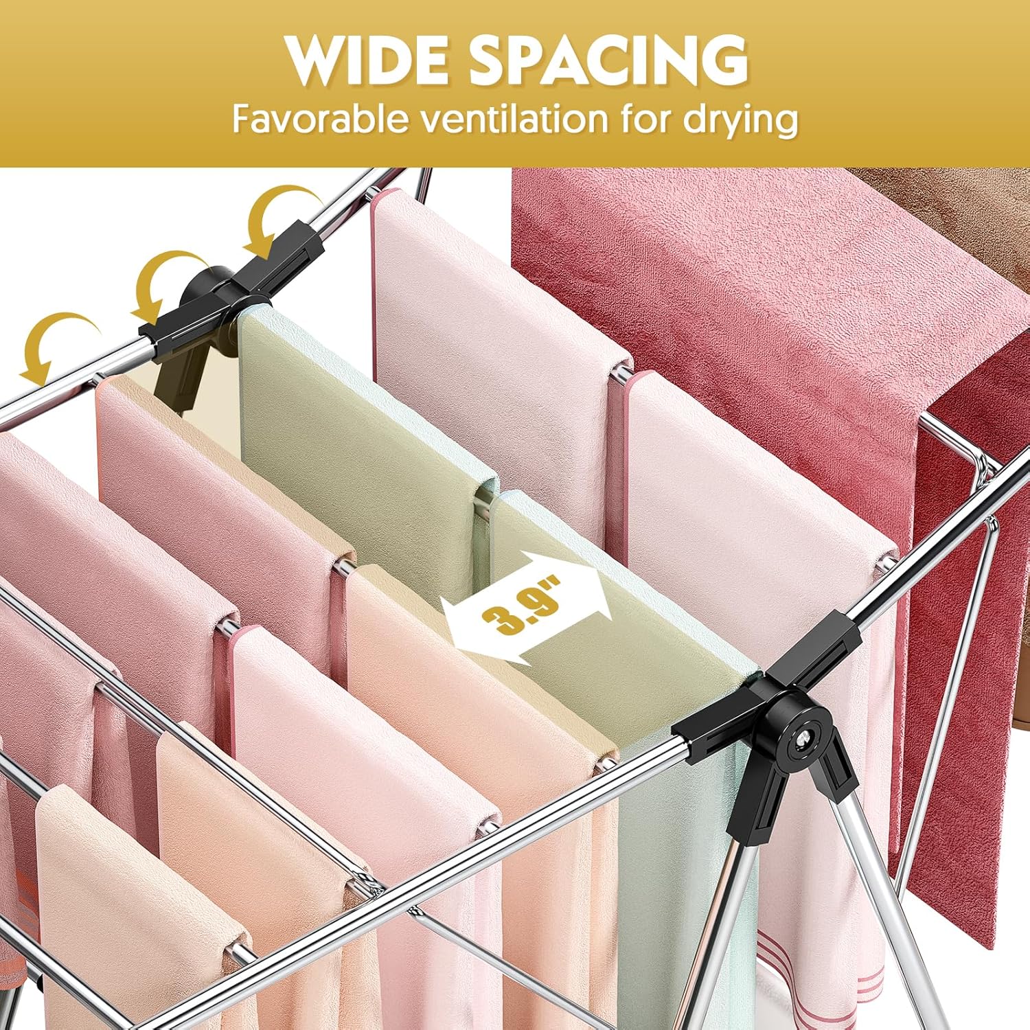• Large Drying Space: Our drying rack is divided into two tiers, the two drying wings unfold to a width of 56.4 inches, and drying quilts is no problem, the lower tier is designed for hanging smaller items such as socks, towels, etc., with a total of 23 rods, providing spacious drying space for the whole family!