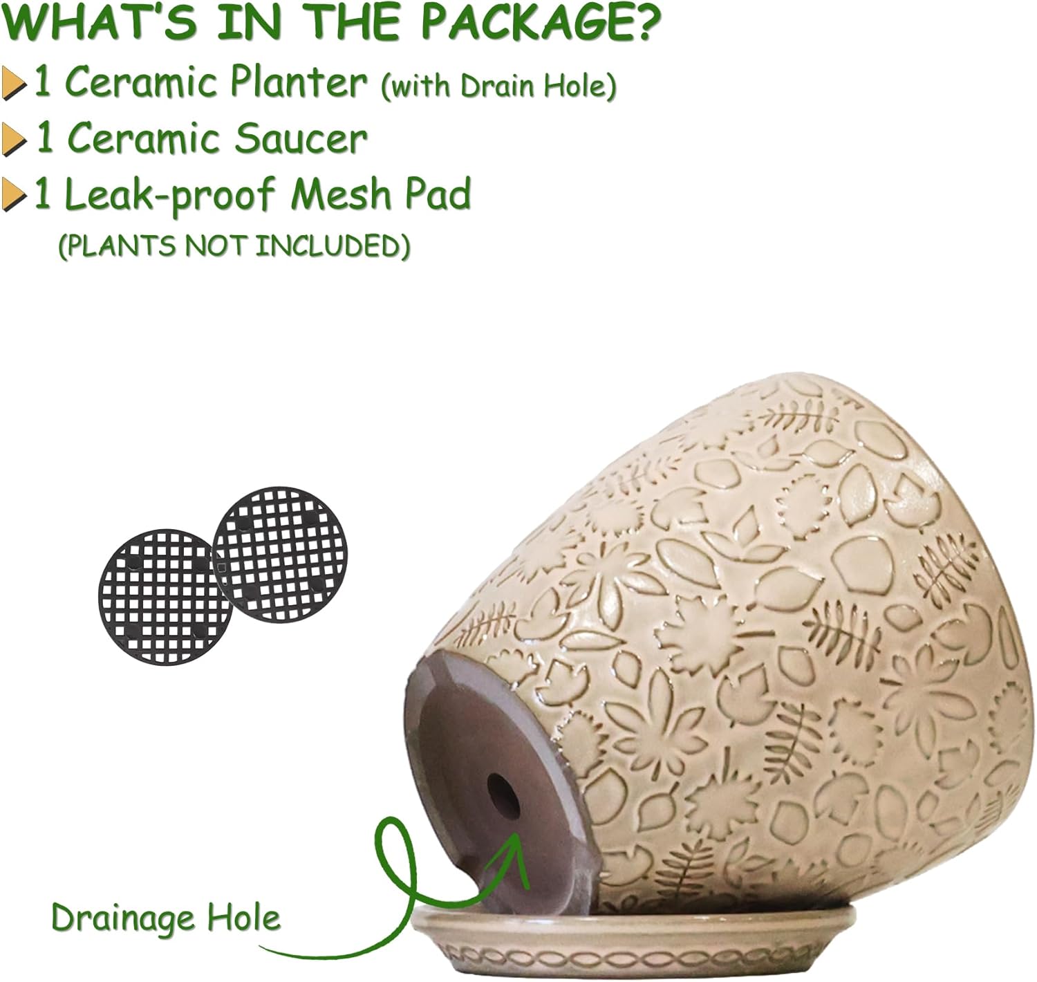 • Size & Package: 10 Inch Pot . Package: contains 1 ceramic flower pots, 1pcs mesh pads and 1pcs saucers(NOT INCLUDE PLANTS)