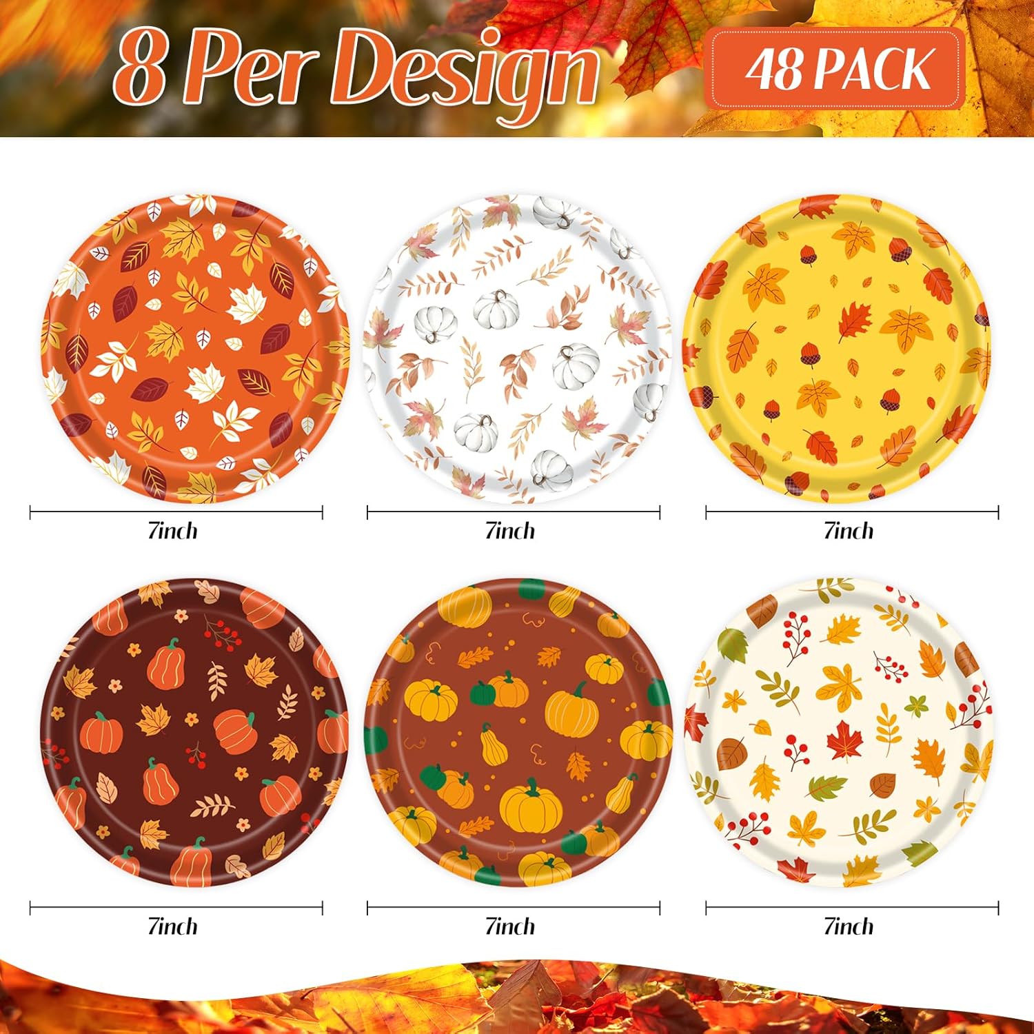 48 PCS Fall Paper Plates 7 inch, Leaves Pumpkin Thanksgiving Party Plates Disposable Cake Dessert Plate for Autumn Theme Party Decorations (Fall)