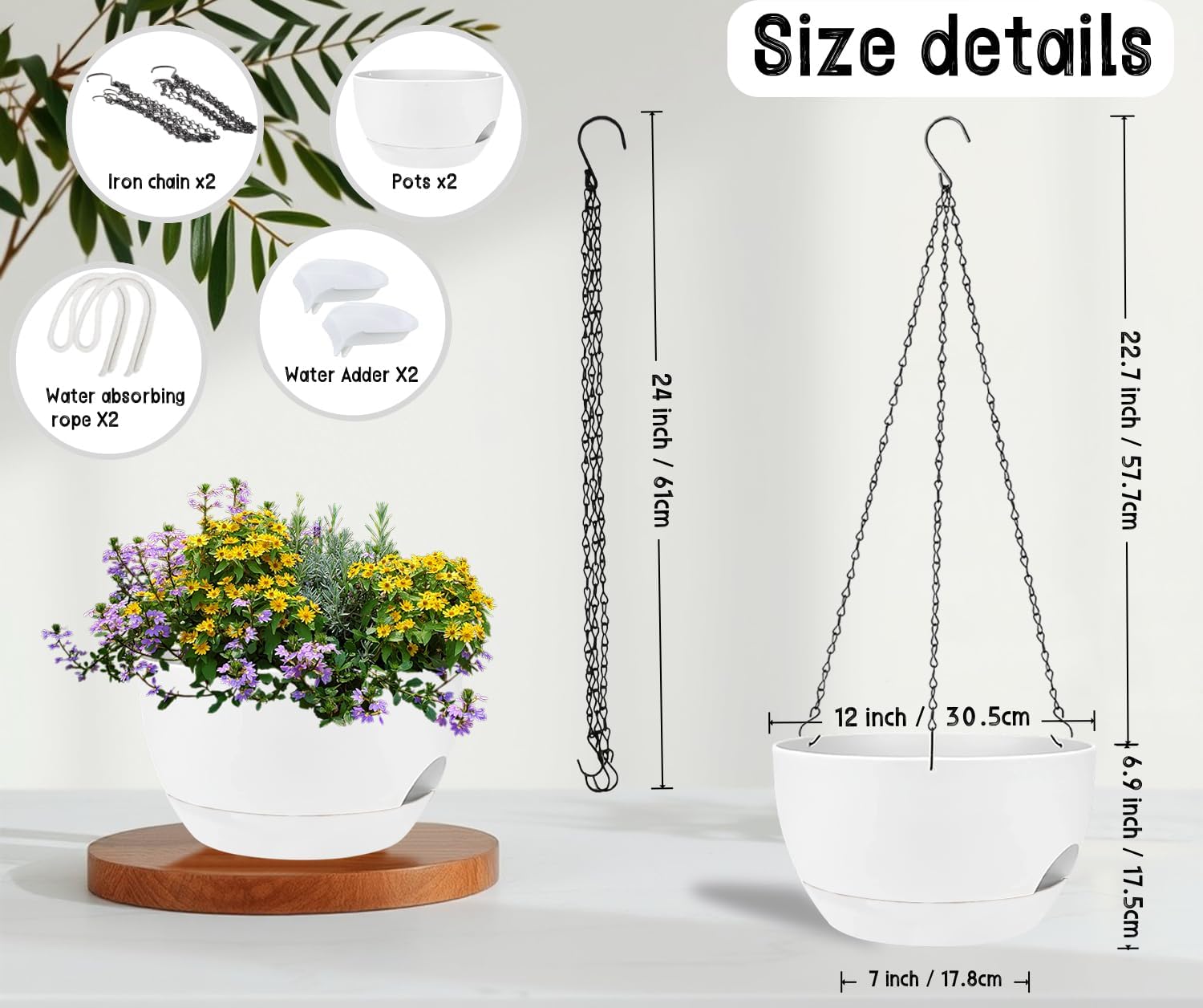 • ✅ 2 Large Self-Watering Planters: Double the value! Includes two 12-inch wide plastic hanging planters with built-in self-watering reservoirs to reduce the need for frequent watering and keep plants healthier.