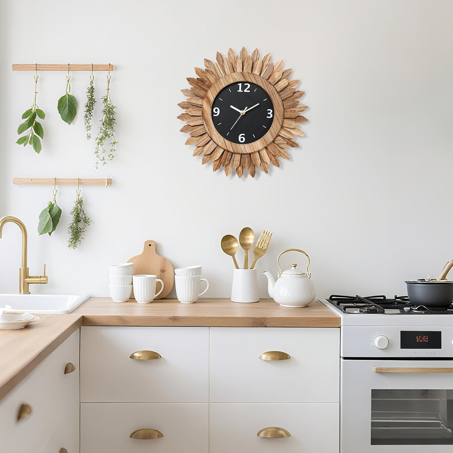 • Boho Wall Decor Clock: Inspired by the sunburst of Bohemian style, this modern wall clock face design is unique and eye-catching, 2 tier wood sunburst looks like the "sun". With a black wooden case, white hour, minute and seconds hands and large white arabic numerals, this decorative wall clock is easy to read from a distance
