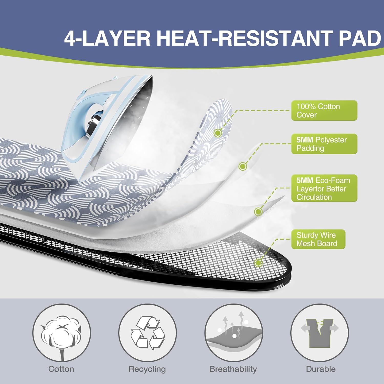 • 3-Layer Ultra-Thick Padding -Enjoy premium protection with a thick, three-layer padded cover that provides excellent cushioning and steam absorption. The special heat-resistant coating shields your garments from scorching and ensures smooth gliding and even heat distribution.