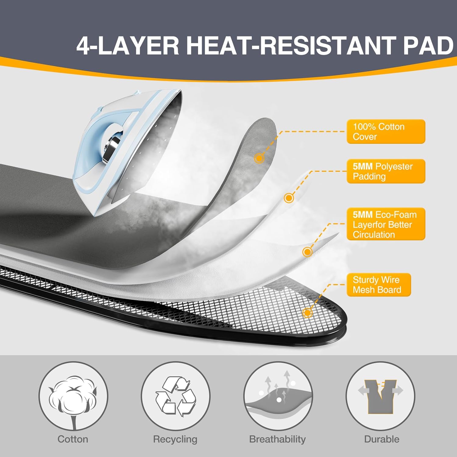 • 3-Layer Ultra-Thick Padding -Enjoy premium protection with a thick, three-layer padded cover that provides excellent cushioning and steam absorption. The special heat-resistant coating shields your garments from scorching and ensures smooth gliding and even heat distribution.