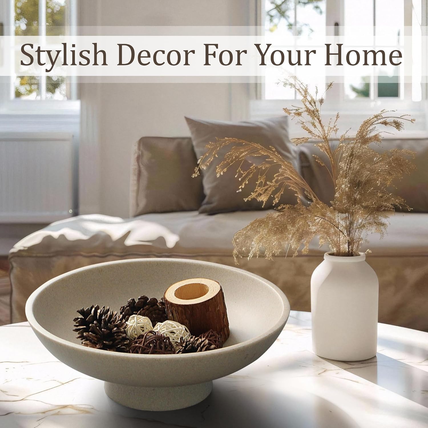 Modern Resin Pedestal Bowl – Large Fruit Bowl for Kitchen Counter, Catch All Tray for Entryway Table, Stylish Key Bowl & Dining Centerpiece, Beige