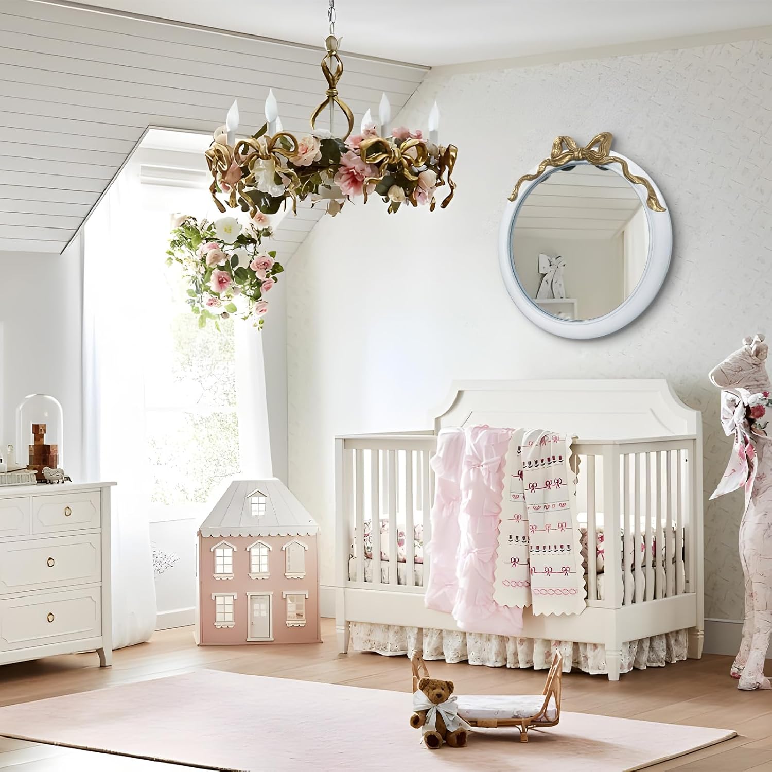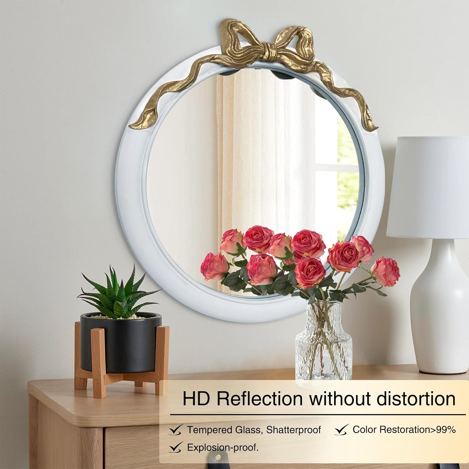 28 inch Round/Circle Wall Mirror, Vanity Bow Mirror for Wall Decor, Decorative Antique White&Gold Bathroom Mirrors, Traditional Art Home Decor for Dressing Table, Living Room, Bedroom