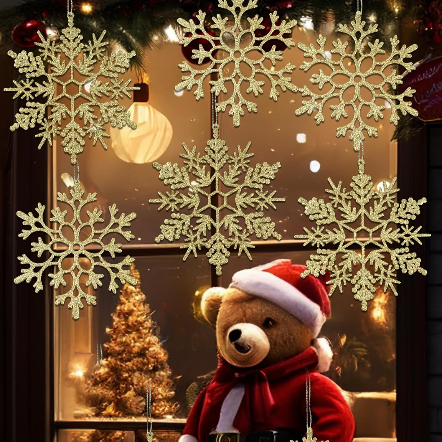 • Premium Snowflakes: These stunning gold snowflakes are crafted from high-quality plastic with a dazzling shimmer. Their durable design allows for years of reuse while maintaining perfect shape. The glitter is securely adhered and resists flaking, making them an ideal choice for Christmas tree decorations