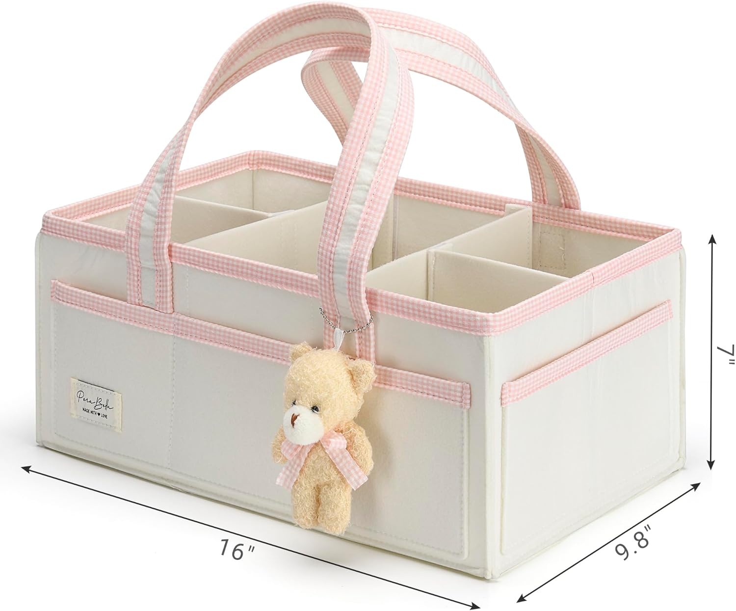 • STYLISH DESIGN AND BONUS TEDDY BEAR CHARM: Crafted with a premium felt exterior, your nursery decor with our neutral diaper organizer. It feels cozy & functional and it looks great on changing table and dresser. The caddy has 8 sturdy outer pockets for ample baby storage and a bonus teddy bear charm, adding a touch of delight