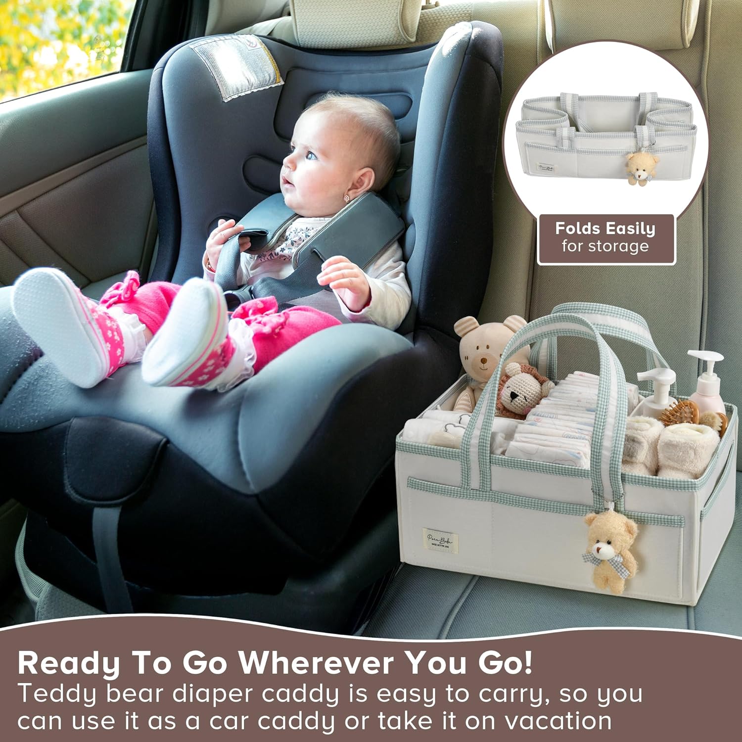 • STYLISH DESIGN AND BONUS TEDDY BEAR CHARM: Crafted with a premium felt exterior, your nursery decor with our neutral diaper organizer. It feels cozy & functional and it looks great on changing table and dresser. The caddy has 8 sturdy outer pockets for ample baby storage and a bonus teddy bear charm, adding a touch of delight