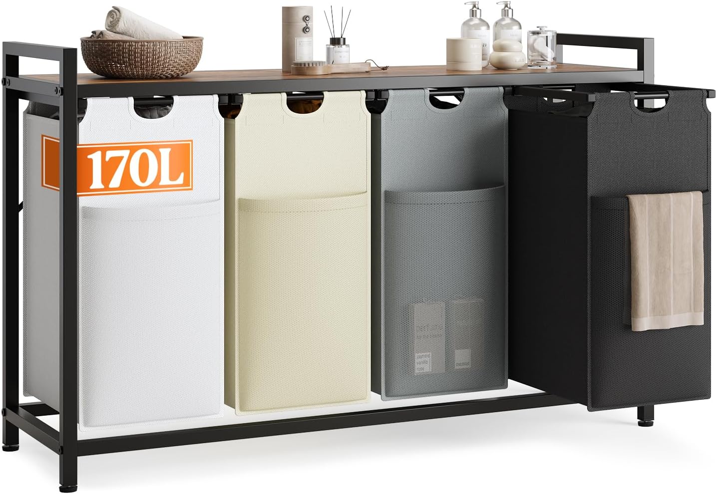 Lulive Laundry Hamper with Shelf, Laundry Basket 4 Section, Laundry Sorter Organizer with Pull-Out Removable Large 4 Color Bags & Large Top Shelf for Laundry Room, Bathroom and Dorm, 4 x 18 Gal (272L)