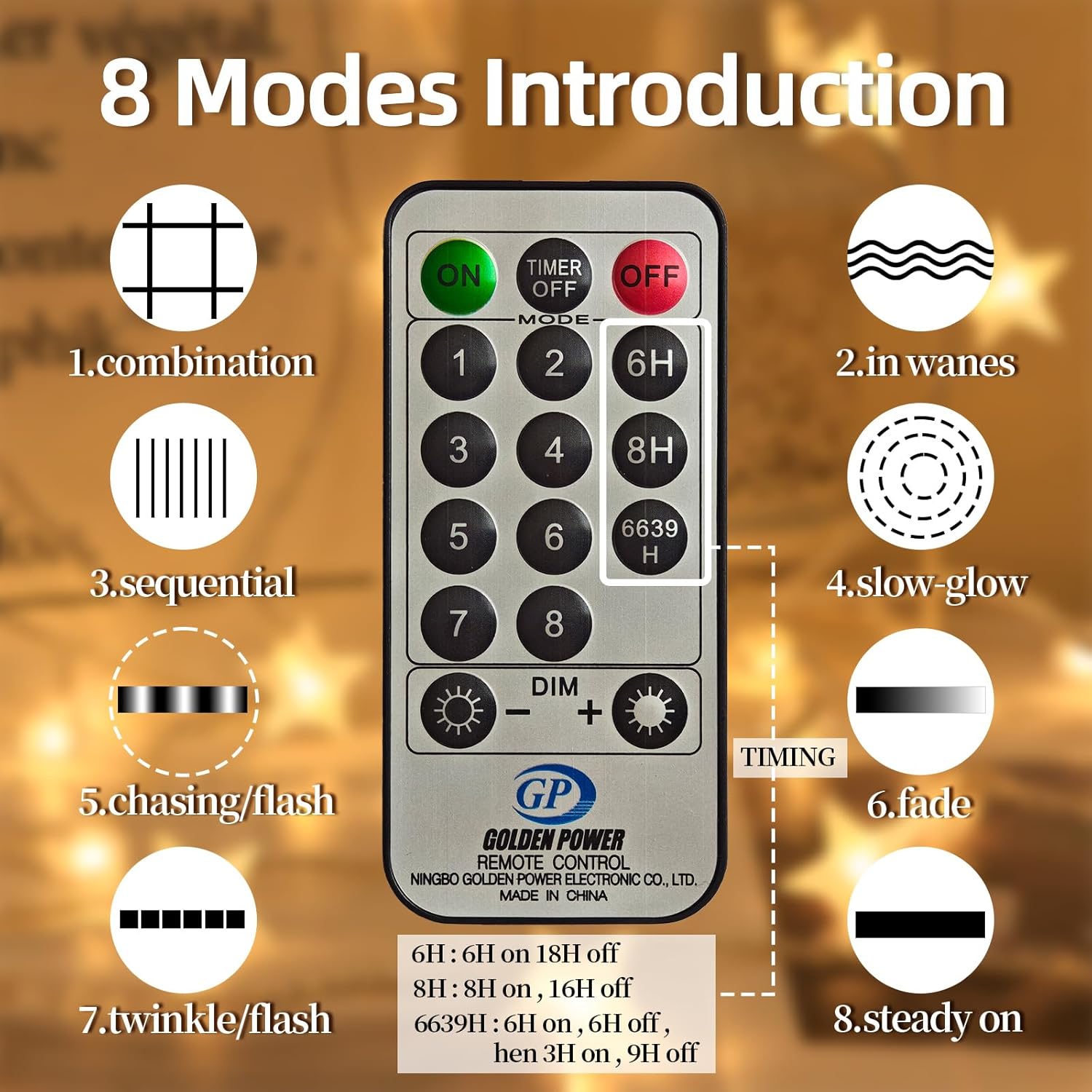 • 8-Mode Control & Smart Timer Remote:​​ Customize the mood with ​​8 distinct lighting modes​​ (memory function saves your favorite!). Set the included ​​remote-controlled timer​​ to turn your lights ​​on for 6 hours and off for 18 hours daily​​, perfect for automation and saving energy. Control it from up to ​​33 FT (10 M)​​ away, even when lights are hard to reach!