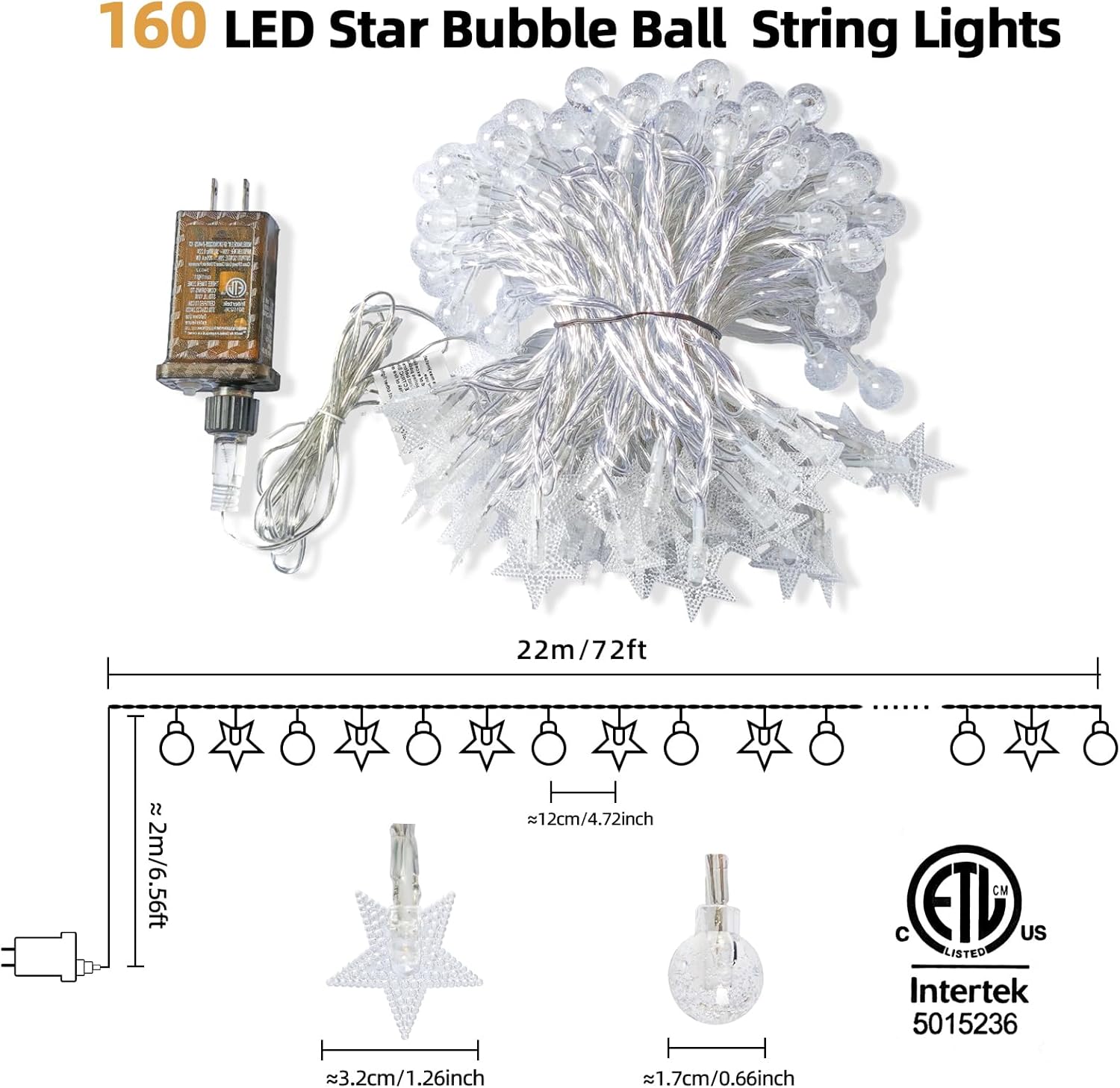 • Magical Ambiance with Spaced Crystal Globes & Stars:​​ Discover a sparkling fairy-tale atmosphere with 160 energy-efficient LED! Beautifully spaced crystal globes and delicate stars cascade across 72 FT (22 M) of gentle, warm white light.
