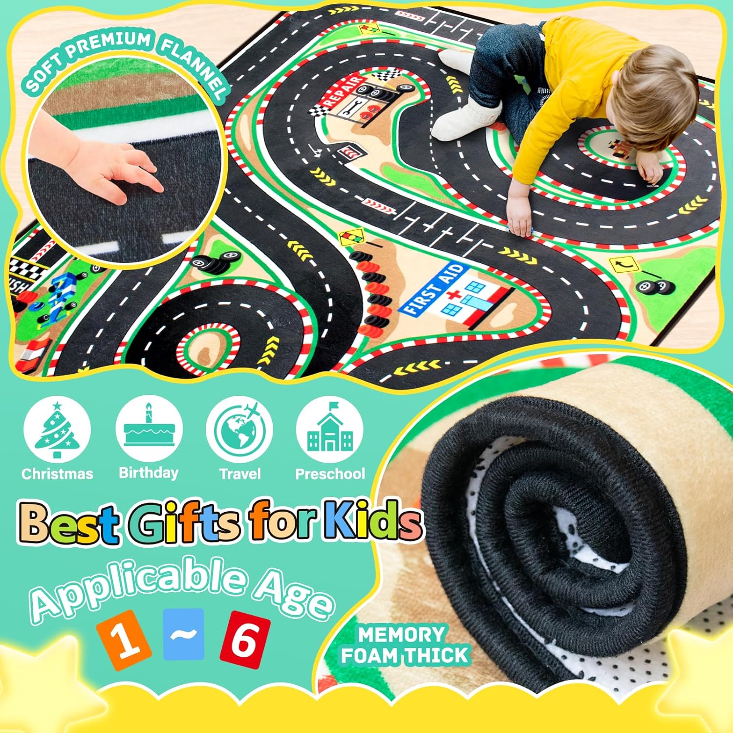 • [Unique Design]: This race track rug features a realistic 3D cascading surround route, complete with a start, and Finish line markings. The car rug is perfect for kids who enjoy playing with race cars. The vibrant colors enhance indoor play, creating an exciting outdoor experience at home