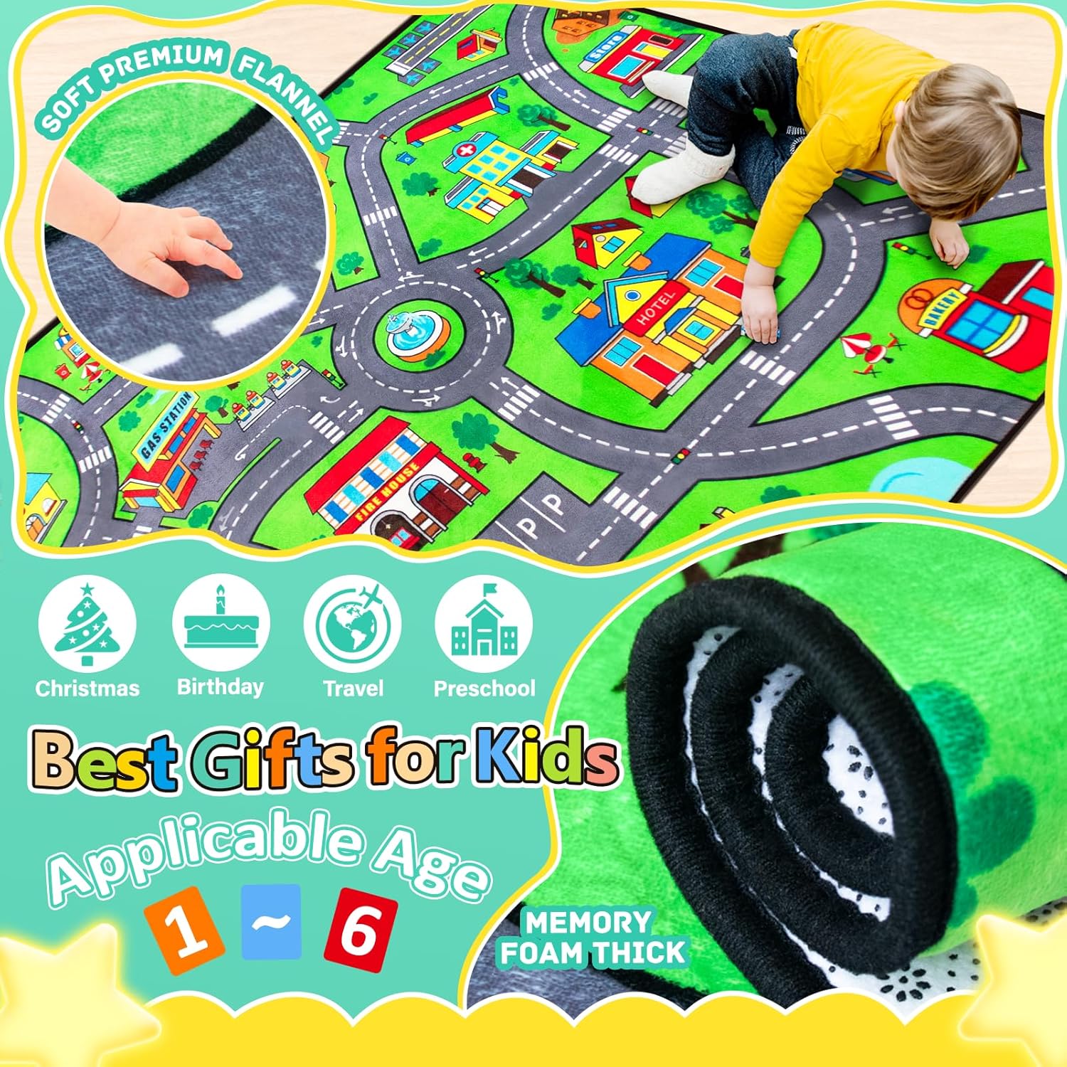 • [Unique Design]This city road rug is the traffic system car mat for kids toy cars,making it perfect for children who enjoy playing with cars,trucks,or fire trucks.The realistic color matching allows your children to have a better outdoor experience indoors