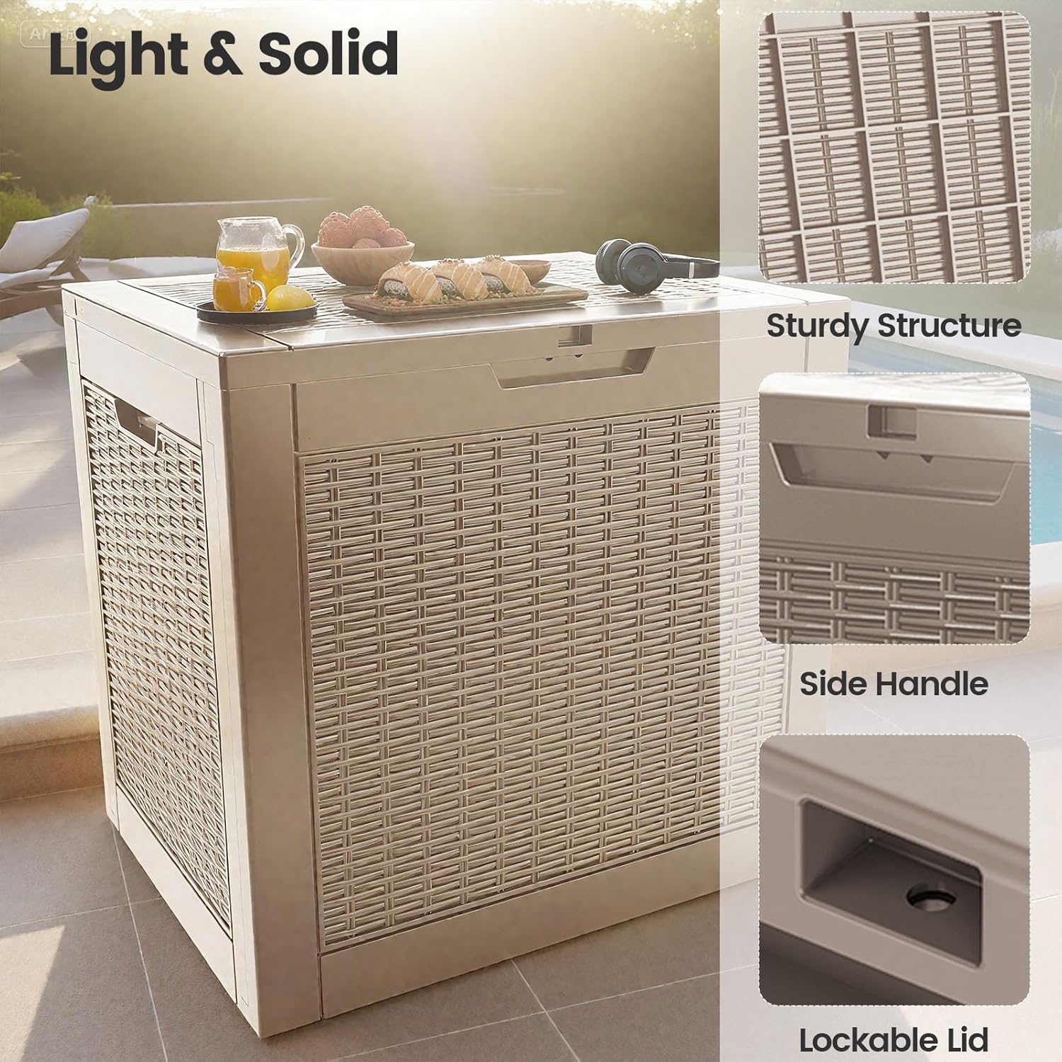 • Elegant Rattan Design: Showcasing a chic rattan effect, this deck box enhances the aesthetic of your patio, garden, or pool area. Its contemporary design seamlessly blends with any outdoor decor while offering practical storage