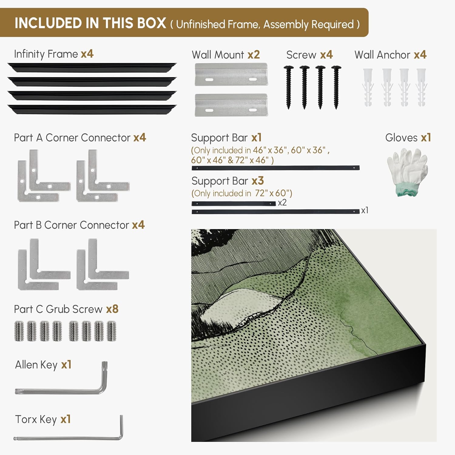 • Assembly Required: The artwork comes with the frame components unassembled. Don¡¯t worry - setup is straightforward and tool-friendly. For best results and accurate alignment, we recommend two people to ensure a smooth assembly and a stable, secure wall mount.