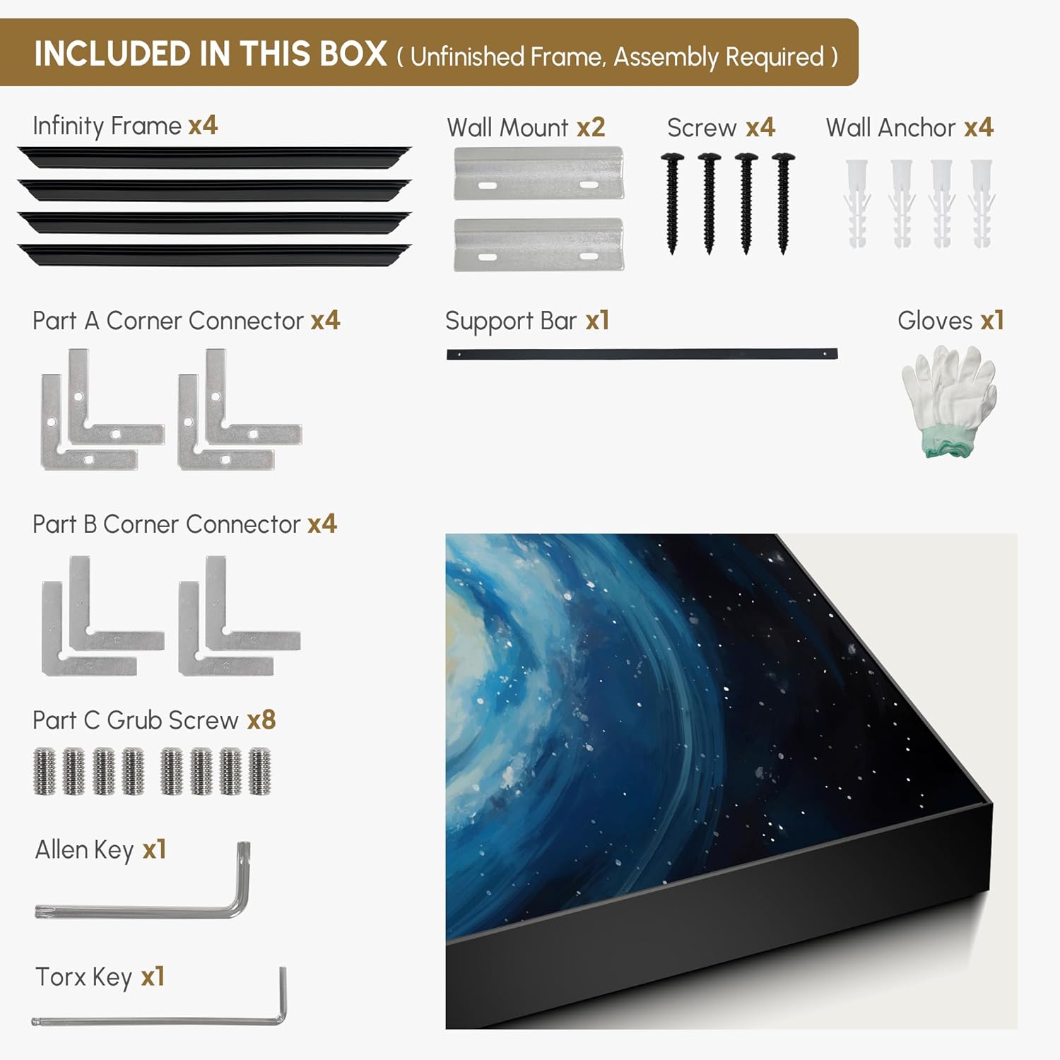 • Assembly Required: The artwork comes with the frame components unassembled. Don¡¯t worry - setup is straightforward and tool-friendly. For best results and accurate alignment, we recommend two people to ensure a smooth assembly and a stable, secure wall mount.