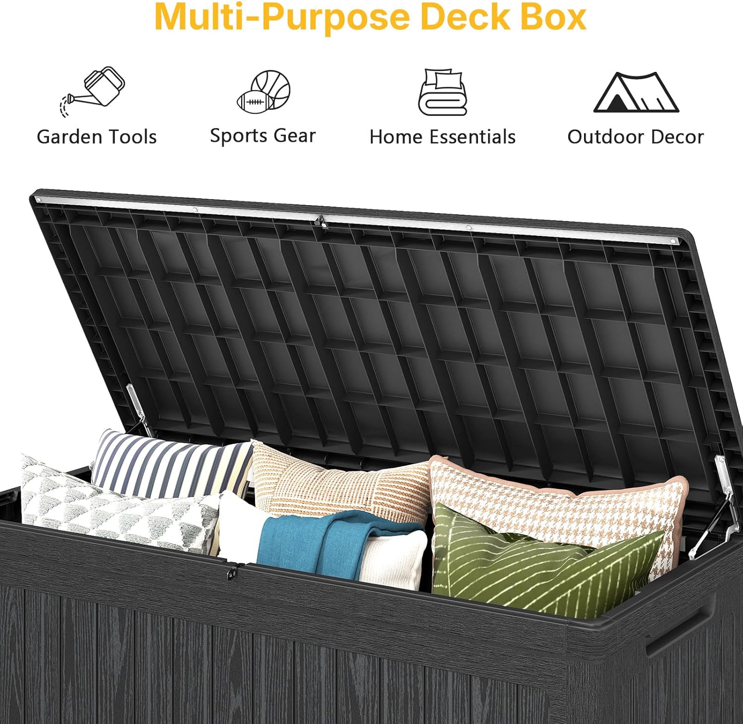 • 【Quick Assembly】230 gallon deck box Designed for instant setup, this deck box assembles in minutes without any tools required. The simple interlocking frame system comes with clearly illustrated instructions for effortless installation right out of the box.