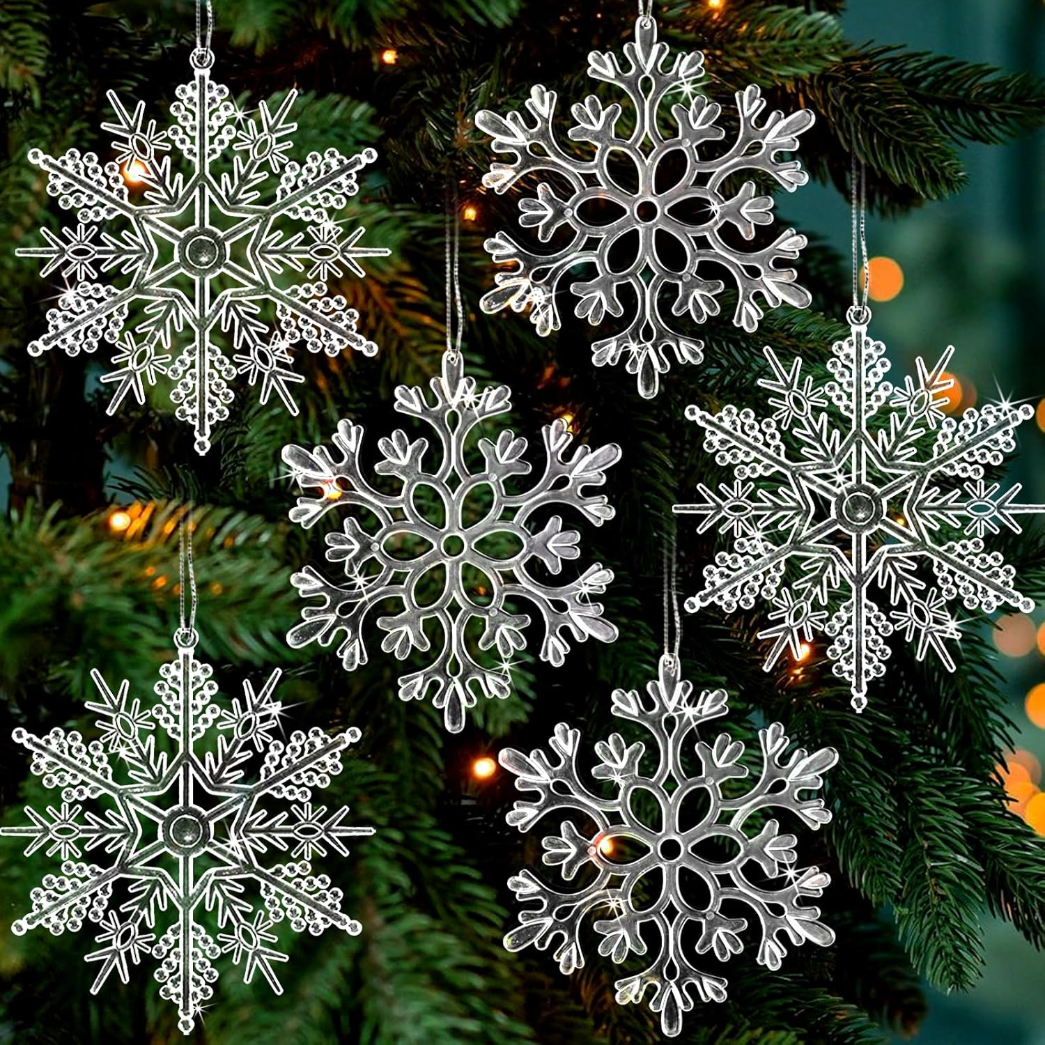 • Designed for Hanging: Our clear glitter snowflakes tree ornaments feature a pre-drilled hole at the top, specially designed for Christmas hanging decoration. Simply use the included rope to hang them effortlessly on Christmas trees, walls, ceilings, windows, fireplaces, porches, mantels, doors, bedrooms, and more
