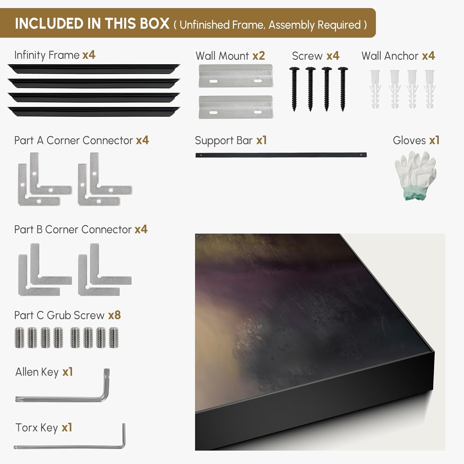 • Assembly Required: The artwork comes with the frame components unassembled. Don¡¯t worry - setup is straightforward and tool-friendly. For best results and accurate alignment, we recommend two people to ensure a smooth assembly and a stable, secure wall mount.