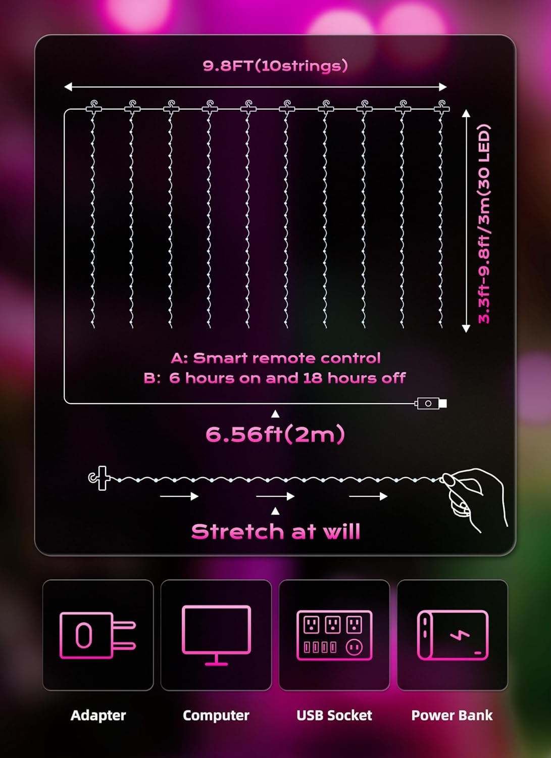 • [Safety & Decoration] Operated with 5V low voltage, our fairy curtain lights glow with low heating, and it is safe to touch; It can be safely hung on the curtains or on the wall. It is a wonderful decor for dorm, college, bedroom, party, birthday, wedding, Christmas, New Year, indoor, outdoor, classroom