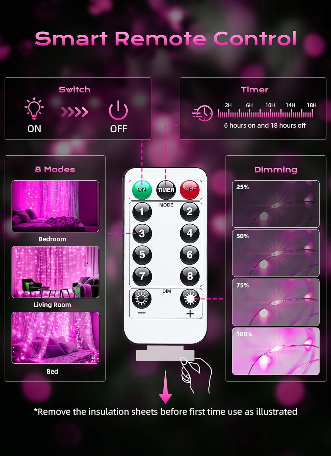 • [Timer & Remote] We can use the remote control to timing for 6 hours on and 18 hours off. What's more, the brightness of our curtain lights is adjustable of 20% 40% 60% 80% 100%