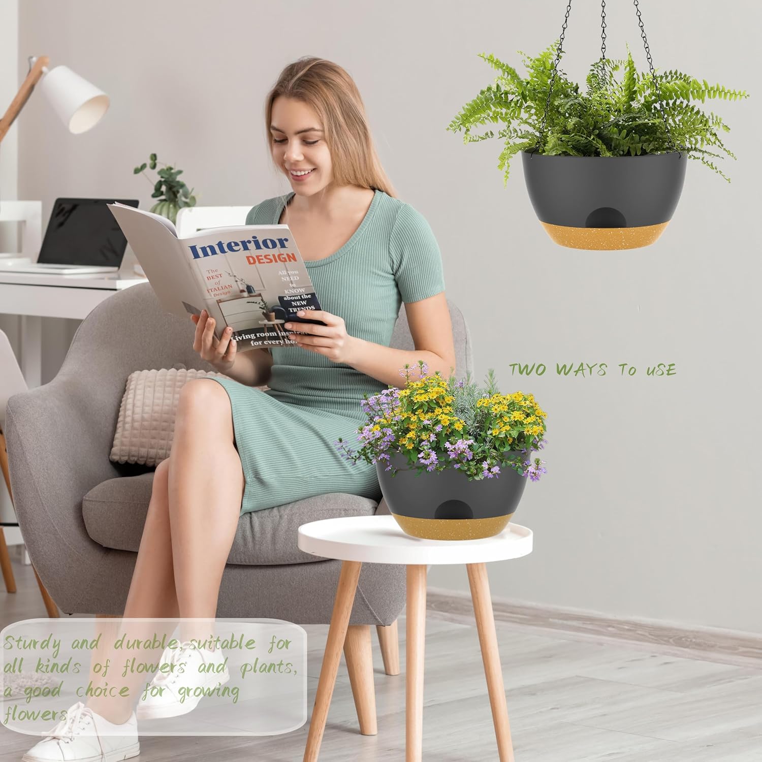 • 【Self-Watering Hanging Flower Pots with Removable Saucer】the appearance and structural design of the Hanging Pot prevents overwatering and acts as a water reservoir to promote Plant growth. It is suitable for a variety of Hanging Pot Plants, such as ivy, Herbs, Ferns, Philodendrons, Succulents, Flowers or other Plants