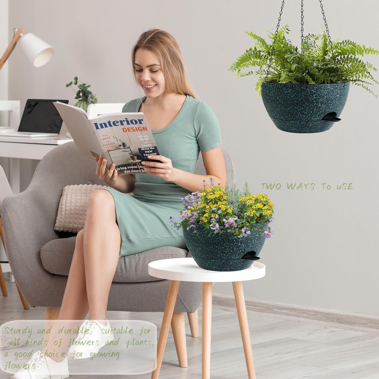 • 【Self-Watering Hanging Flower Pots with Removable Saucer】the appearance and structural design of the Hanging Pot prevents overwatering and acts as a water reservoir to promote Plant growth. It is suitable for a variety of Hanging Pot Plants, such as ivy, Herbs, Ferns, Philodendrons, Succulents, Flowers or other Plants