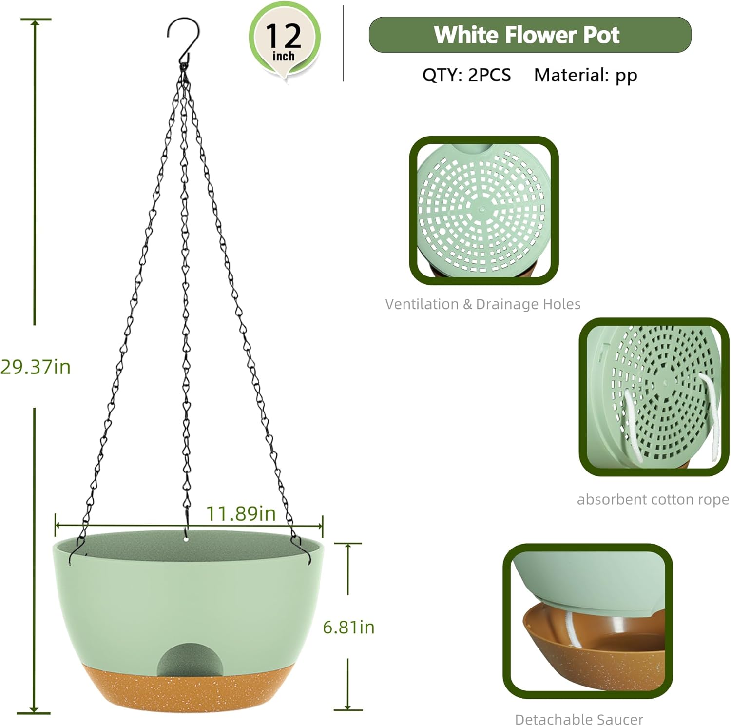 • 【Package Content】12 Inch Self-Watering Plastic Flower Pots x 2,Chain rack x 2,these Planters are easy to install and suitable for Hanging in various locations such as Balconies, Windows and Gardens