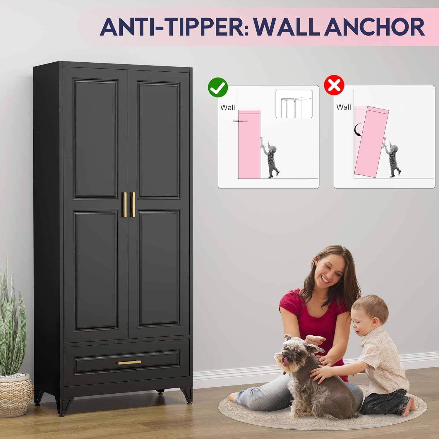 • Secure Anti-Tip Design: Built-in wall mounting holes secure the tall cabinet to prevent tipping and ensure safety around children or pets. Adjustable legs compensate for uneven floors and prevent wobbling. Reliable pantry storage cabinet for kitchens, garages, or home offices